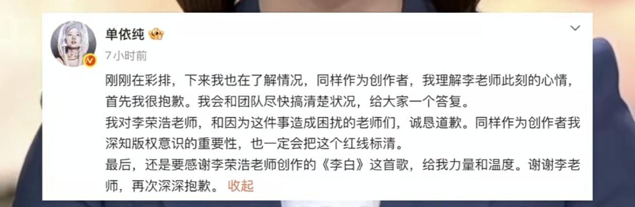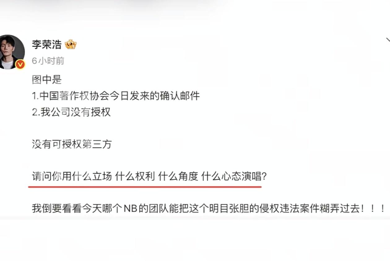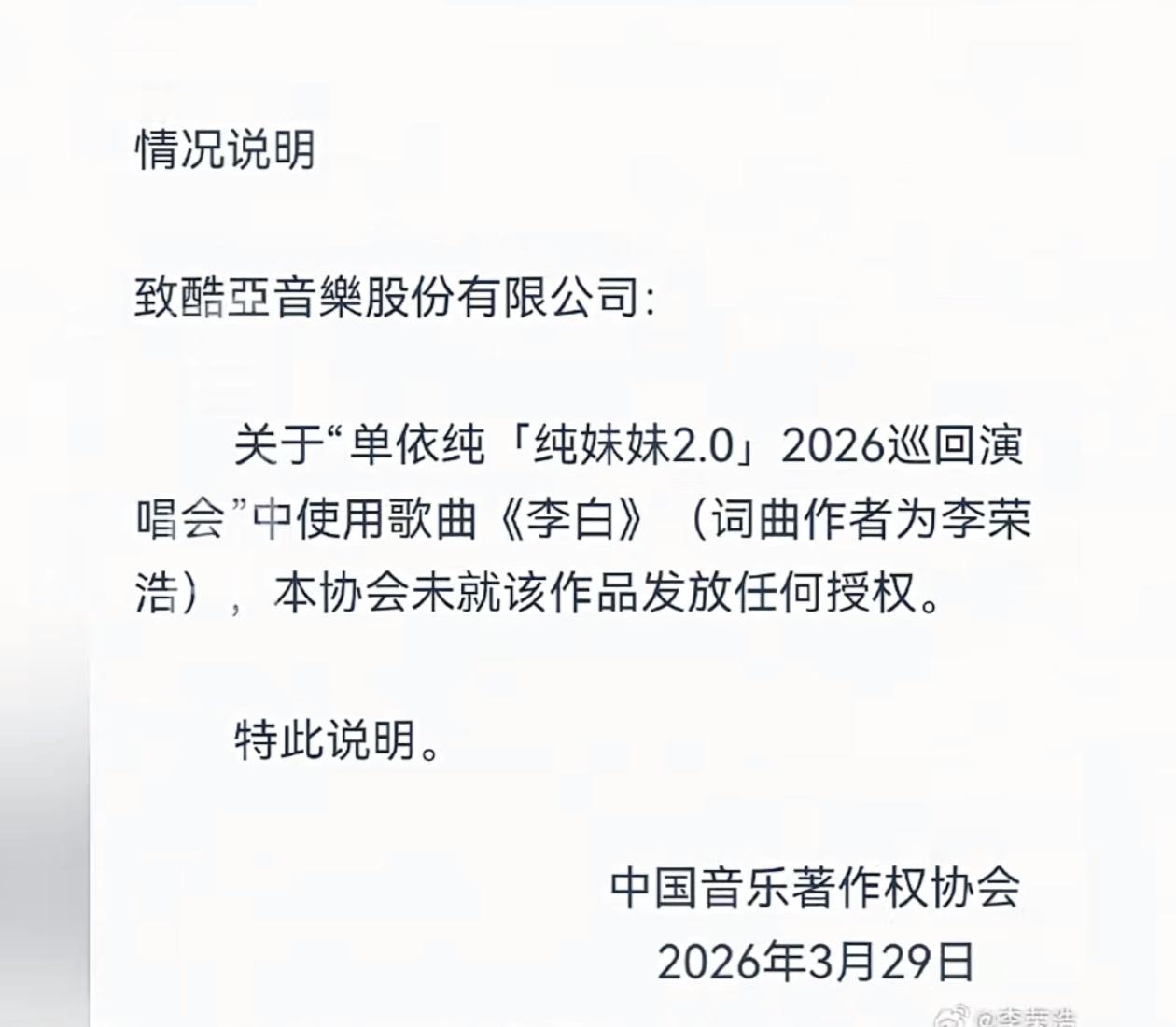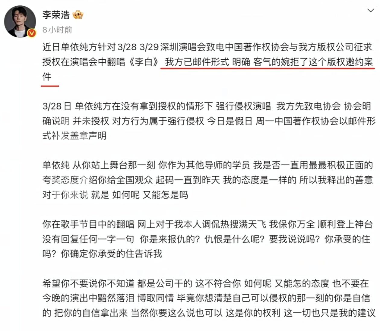 请问你用什么立场、什么权利、什么角度、什么心态演唱? 李荣浩四连问怒撕单依纯。 从《中国好声音》里的前辈提携,到演唱会现场的公然侵权,李荣浩和单依纯的这场版权风波,撕开了华语乐坛最刺眼的一道伤口。 单依纯团队为深圳演唱会申请翻唱《李白》授权时,李荣浩方早已明确婉拒,中国音乐著作权协会也盖章确认:从未发放任何授权。可3月28日晚,单依纯还是站上舞台,唱着那首被她改编得面目全非的《李白》,把“我本是辅助,今晚来打野”的戏谑歌词,唱成了对原创者最赤裸的冒犯。 更讽刺的是,李荣浩曾在节目里不遗余力地夸她、保她周全,连《歌手》里那次引发全网调侃的改编,他都选择沉默。可这份善意,换来的却是“如何呢 又能怎”的挑衅,和明知侵权仍要登台的决绝。 单依纯后来道歉了,说“没亲自核查授权”,愿意承担赔偿。可演唱会现场那滴眼泪,终究没能洗清“强行侵权”的事实——商业演出不是综艺彩排,版权红线从来不是“信任团队”就能绕开的借口。 李荣浩的愤怒从来不是针对一首歌,而是对“原创者的权利可以被随意践踏”的反抗。当后辈踩着前辈的作品往上爬,当“没授权”变成“我以为可以”,华语乐坛的根基,早就在一次次侵权里被掏空了。 这一次,没人能再把“明目张胆的侵权”糊弄过去。毕竟,能把一首歌唱成“得了灰指甲、一个传染俩,问我怎么办、快来用亮甲,怎么办,用亮甲,怎么办,用亮甲,怎么办——用亮甲——”,也真是没谁了!