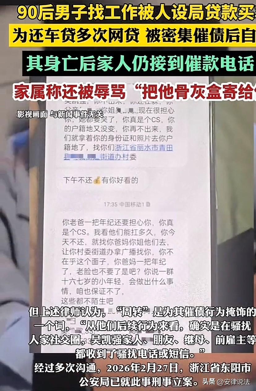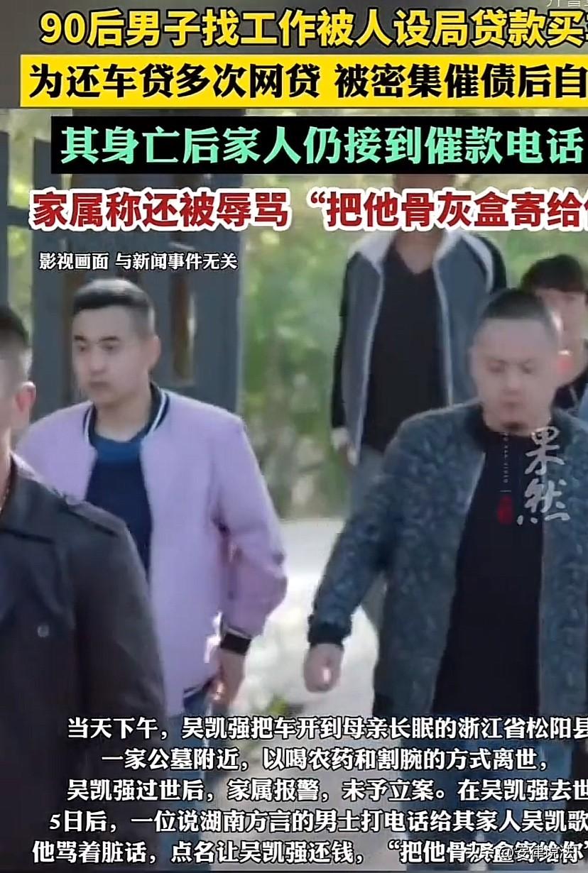 浙江东阳,33岁男子工作十年,在失业后,瞒着家人偷偷找了一份工作。对方承诺给其配一辆车,指派一份保底1.2万元的驾驶员工作。哪曾想,男子按照对方的要求提供相关资料并签订入职手续后,发现,自己竟然贷款买了一辆车,对方还食言,直接让他自己去注册网约车,自己接单赚钱。男子无奈之下照做,结果一个月累死累活赚的钱还不够偿还贷款月供的,无奈又多次网贷。结果因为逾期还款,又被无休止的催债。男子最终彻底崩溃,大晚上留下一份遗书,而后跑到母亲的墓地边自杀死亡。令人气愤的是,男子死后,仍有人将电话打给男子家人,威胁、辱骂男子的家人,扬言“把他的骨灰盒寄给你”! 据悉,吴某的母亲走得早,父亲又格外严厉。 2015年,吴某从职校毕业后,便在县城法院做合同工。 这份工作虽然挣不了多少钱,但也算得上安稳、体面。 起初,吴某的父亲也没说什么,后来听说,吴某继母的儿子开设计公司很赚钱,便让吴某辞了职,去学设计。 结果,吴某刚学完设计,那家设计公司就倒闭了。 吴某无奈从网上找了份做图的工作,后来还去云南舅舅的店里打了一阵子工。 2021年,又回到老家做仓管员,始终没能稳定下来。 随后,吴某的父亲又觉得吴某的工作,没有什么前景,又执意让吴某去工厂。 吴某起初不愿意,但是拗不过自己的父亲去了丽水的一家工厂,每天和机器打交道,白班夜班来回倒。常常跟姐姐抱怨工作太累,有时候还会不小心把机器做坏了,一个月还要被扣一千块左右。没撑两三个月,就辞职回了家。 吴某回家后,又在一家林业公司找了一个工作,不过没多久,因为一场考试没通过,便主动提出了离职。 或许是担心被父亲指责,或许是为了证明自己,这次吴某离职后并没有告诉给家里的任何人,偷偷找起了工作。 2024年6月25号那天,吴某在招聘平台上加了一个微信昵称为“A风总监”的人,对方告诉他,正在招聘驾驶员,保底工资1万2,还承诺公司配车,不用交押金、不用交保证金。 急于找到工作的吴某,一听就动了心,也没多想,便按照对方见面,并按照对方的要求向对方提供了身份证、驾驶证和银行卡等等材料,并签订了所谓的“入职资料”。 事后,吴某才发现自己签的根本不是什么入职资料,而是一堆贷款买车的资料。 购车后,“A风总监”之前承诺的1万2保底工资、公司配车安排工作,也全都没了下文。只是让吴某自己注册网约车平台,接顺风车单赚钱。 吴某这才意识到不对劲,可想到车已经买了,贷款也已经生效,只能硬着头皮开起了顺风车。 随后,吴某每天起早贪黑,就为了能还上每月约3200元的车贷,但是无论吴某怎么努力,但大多数情况下连3000元都赚不到。 走投无路之下,吴某只能向网贷平台借款。期间,还担心被家里人发现,在外租了个简陋的小屋住,给家人谎称被调到了另一家包吃包住的林业公司。 2025年10月19号,也就是在他网贷逾期的第一天,一早就有贷款平台通过电话、短信催他还债,甚至有人通过支付宝转给他0.01元,还留言嘲讽:“看看你能躲多久哈”“继续加大力度走”。 吴某最终产生轻生的念头,在网上搜索的各种死亡方式,足足有80多条。 当天晚上,吴某在邮箱里留下一份遗言,称:“对不起,对不起对不起对不起姐姐爸,我扛不住了,我每天不停地开车,但他们还是不停地骚扰我,说要找你们。我真的很怕,我真是废物,我对不起你们。他们什么都会做出来的,我不想死,真的不想。” 而后开车买了农药,前往母亲的墓地附近,先后吞下了农药,割腕,结束了自己的生命。 令人难以释怀的是,事发后,还有催债人因不知道吴某已经去世,给吴某的家人打电话,电话里满是脏话,指名道姓让吴某还钱,甚至恶语相向:“把他骨灰盒寄给你”“你说一群十六七岁的小年轻,会做出什么事情,咱也保证不了。这些都不陌生吧?”…… 吴某的家人难以释怀,而后报警。 《刑法》第266条规定,诈骗公私财物,数额较大的,处3年以下有期徒刑、拘役或者管制,并处或者单处罚金…… 以招聘司机、宣传月入过万、公司配车,实则是个人贷款买车,这样的事情并不少见,应当注意的是,这样的行为其实就是诈骗。 采用非法方式催收非法债务同样构成犯罪! 《刑法》第293条之一规定,有下列情形之一,催收高利放贷等产生的非法债务,情节严重的,处3年以下有期徒刑、拘役或者管制,并处或者单处罚金:(一)使用暴力、胁迫方法的;(二)限制他人人身自由或者侵入他人住宅的;(三)恐吓、跟踪、骚扰他人的。 据悉,虽然吴某系自杀身亡,但与被骗、催收存在直接的关系,目前当地警方已经将此案列为刑事案件处理! 等待涉事人员的将是法律的严惩! 最后,也借本案再次提醒广大朋友们,找工作时,一定要多留个心眼,不要被“高薪”“轻松”的承诺所迷惑,一旦发现不对劲,要及时拿起法律武器保护自己。 这事你怎么看?