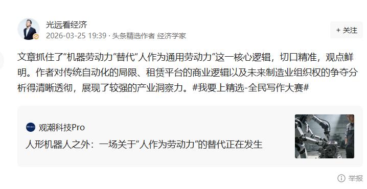 这篇关于人形机器人的文章,有一个很突出的优点:它没有停在“技术炫酷”,而是直接往产业底层去拆。作者抓住了一个关键词——“机器劳动力”,一下子把问题从“机器人会不会跳舞”,拉到“未来谁来干活、怎么组织干活”。 整篇文章的结构也很清楚。先讲为什么传统自动化走到瓶颈,再讲为什么租赁平台先火,最后落到“劳动力组织权”。比如写机械臂“效率高但不通用”,写租赁平台“降低试错门槛”,再到企业真正关心的“单小时成本”,这些细节一出来,逻辑就立住了。读者能看懂,不是因为概念简单,而是因为拆得够具体。 而光远的点评,点得很准。他提到“机器劳动力替代通用劳动力”这个核心,其实就是帮读者抓住了整篇文章最重要的那条主线。再加上对自动化局限、商业路径和产业竞争的肯定,等于把这篇文章的价值框出来了——这是在讲一个“结构性变化”,而不是单点技术。 放在“我要上精选”这个活动里,这类内容很有代表性。一边是作者用产业逻辑做深度拆解,一边是专业导师做关键提炼,两者形成一个很完整的内容闭环。读者既能看到结论,也能看到推导过程。 再看整体赛道,会发现一个明显变化:越来越多文章开始从“讲现象”走向“讲结构”。有逻辑、有路径、有判断,这说明平台在持续引导更高质量的创作方向。 对写作者来说,这样的环境很重要。有机会被专业人士看到,也能被指出真正的亮点在哪里。写作不再只是表达观点,而是在不断训练自己的分析能力和表达能力。