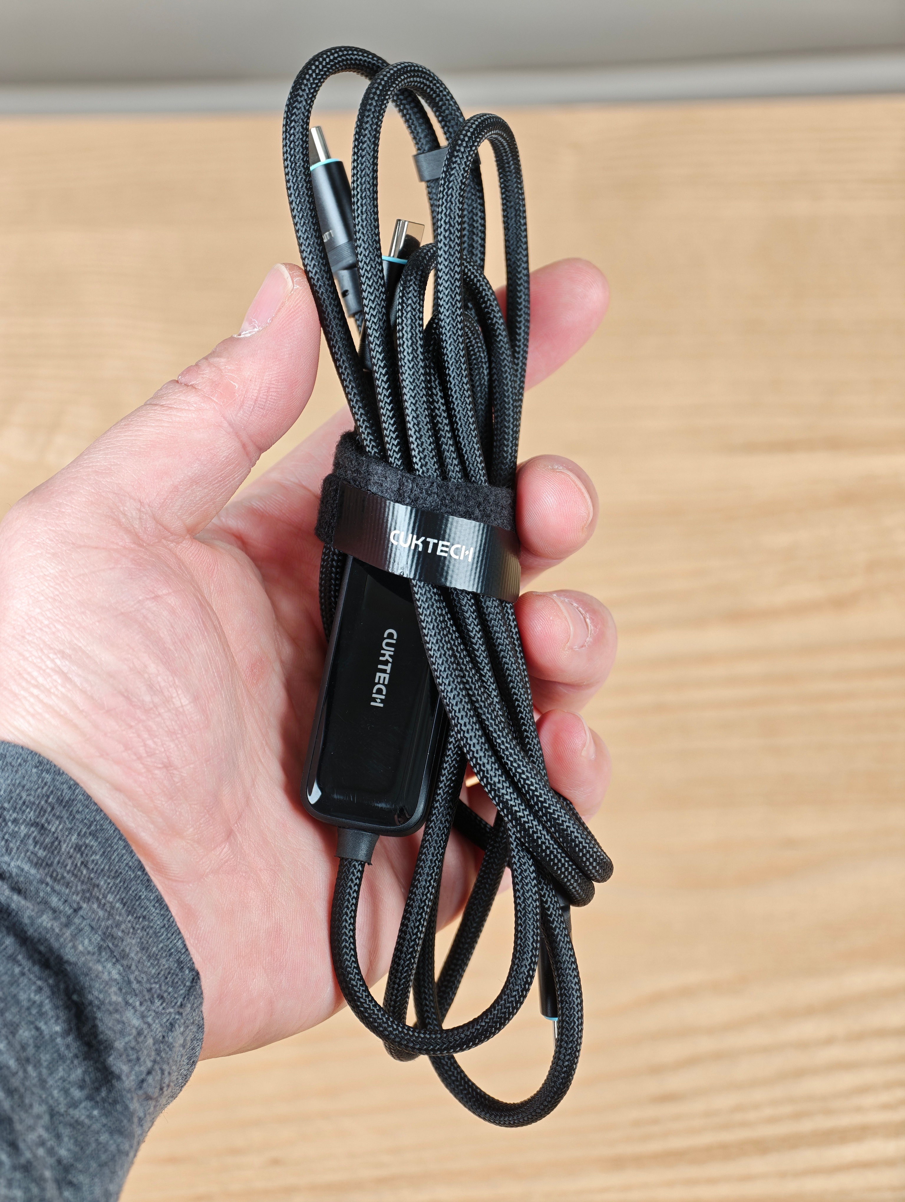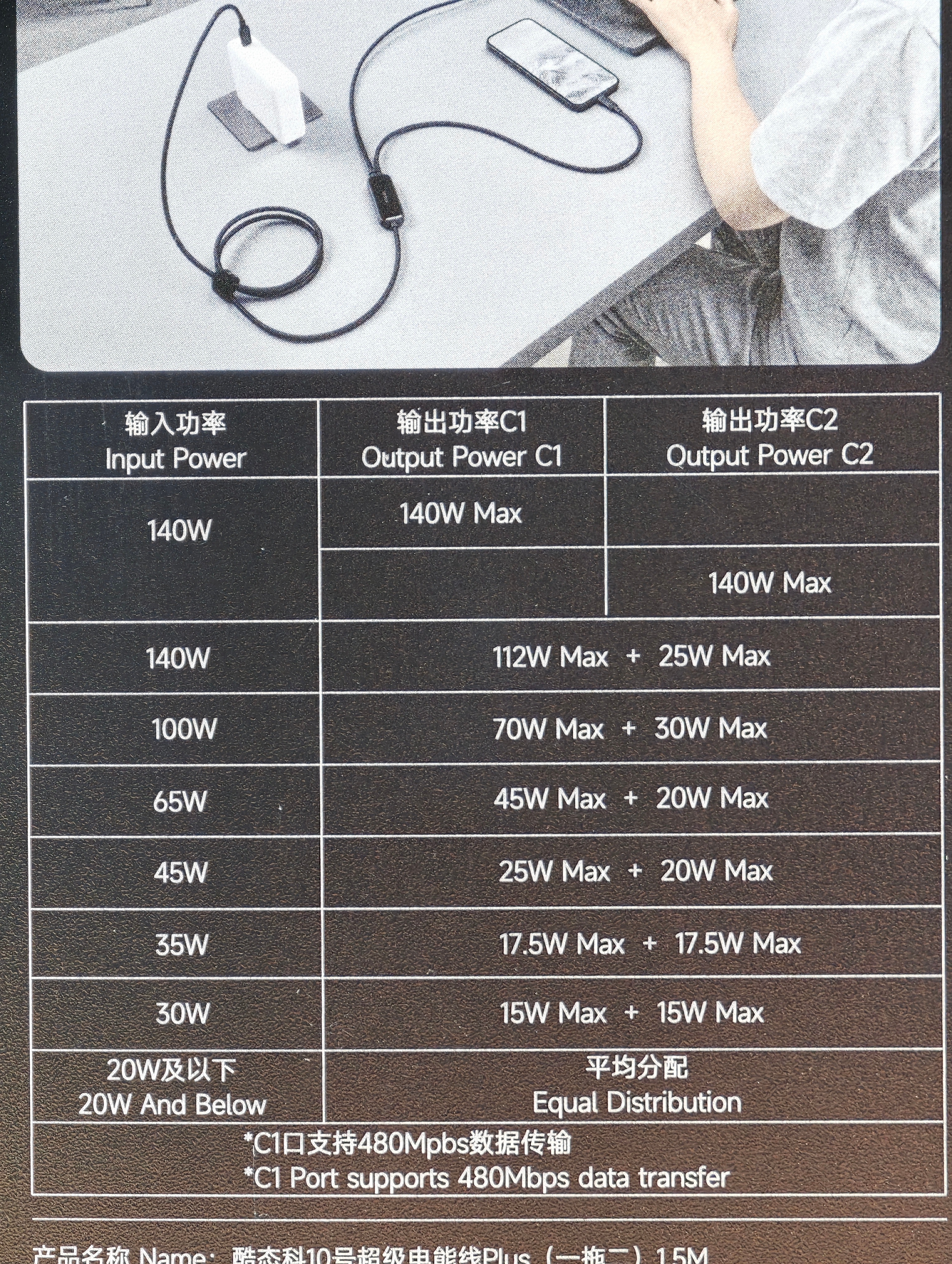 核心卖点就是140W Max+一拖二+1.5米长,支持智能功率调控,全部都是编织线材质,双口给了束线器,整体也给了竖线带,这样线就不会乱跑,收纳起来非常方便。这根线双口都支持140W Max,如果140W下一分二,那就是112W+25W,笔记本+手机一起充还是OK的。