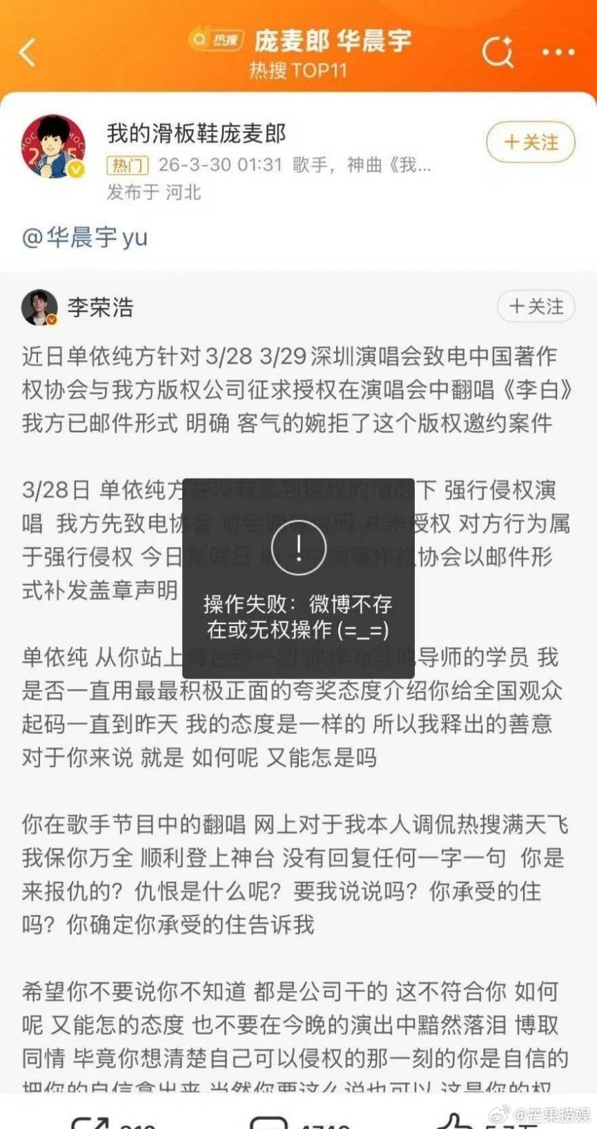 庞麦郎删除转发 登上热搜,一场闹剧来得快去得也快。庞麦郎借李荣浩维权事件,突然转发艾特试图引发舆论关注。工作室干脆利落表态,直接甩出证据链,不拖泥带水。眼见舆论不占优势,庞麦郎立马删除转发,前后反差令人唏嘘。从当年的爆红到如今反复消费旧作,庞麦郎的操作让不少网友感到失望。版权问题本应严肃对待,而非成为博眼球的工具。与其纠结过往纠纷,不如专注创作新作品,用实力说话,远比炒作更能赢得尊重。