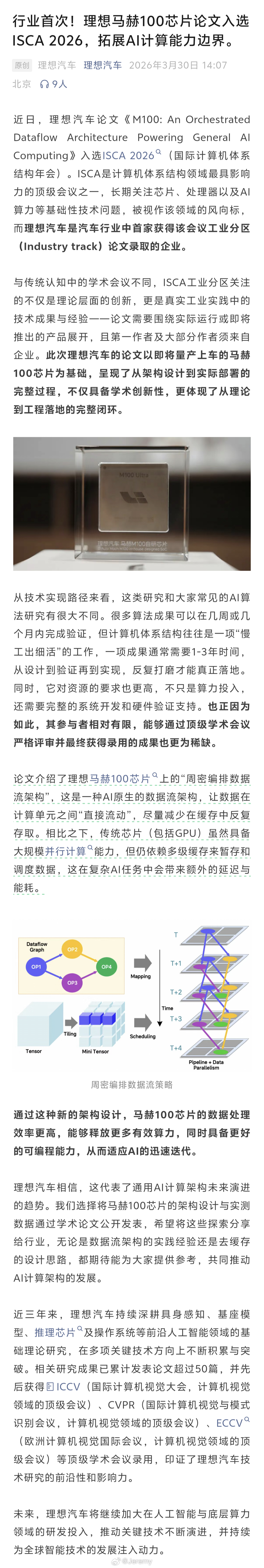 理想芯片拿下世界冠军级认证 理想汽车论文《M100: An Orchestrated Dataflow Architecture Powering General AI Computing》入选ISCA 2026(国际计算机体系结构年会)。