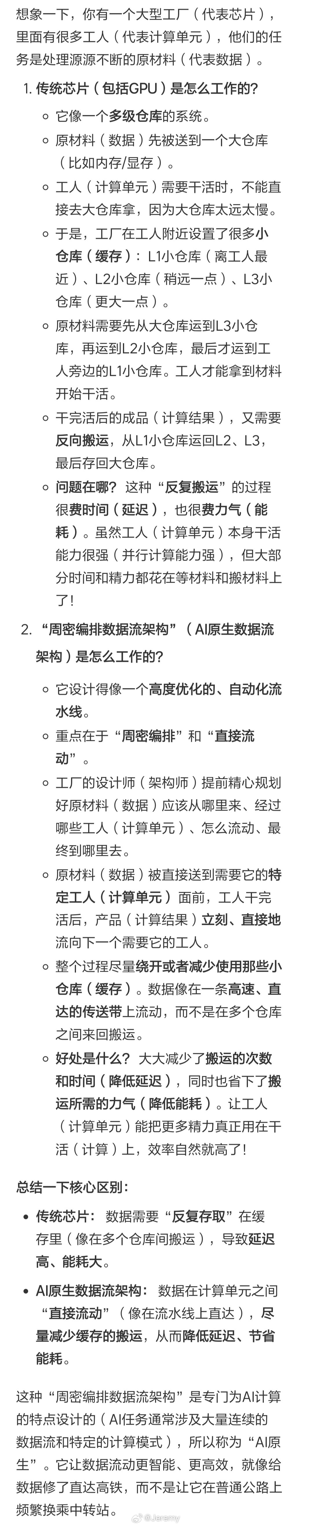 这种“周密编排数据流架构”是专门为AI计算的特点设计的(AI任务通常涉及大量连续的数据流和特定的计算模式),所以称为“AI原生”。