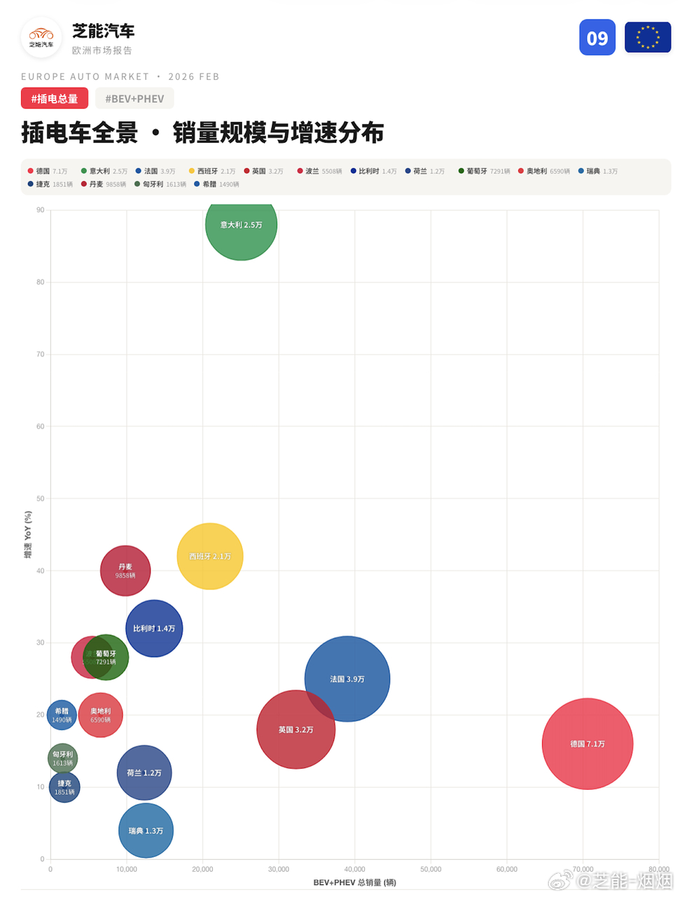 中等规模市场普遍以混动作为主流选择,贴合实用需求与预算考量。成熟发达区域电动化渗透程度很高,政策推动特征突出,数据波动相对明显。南欧地区更认可插混车型,用来平衡长途出行与补能条件限制。
