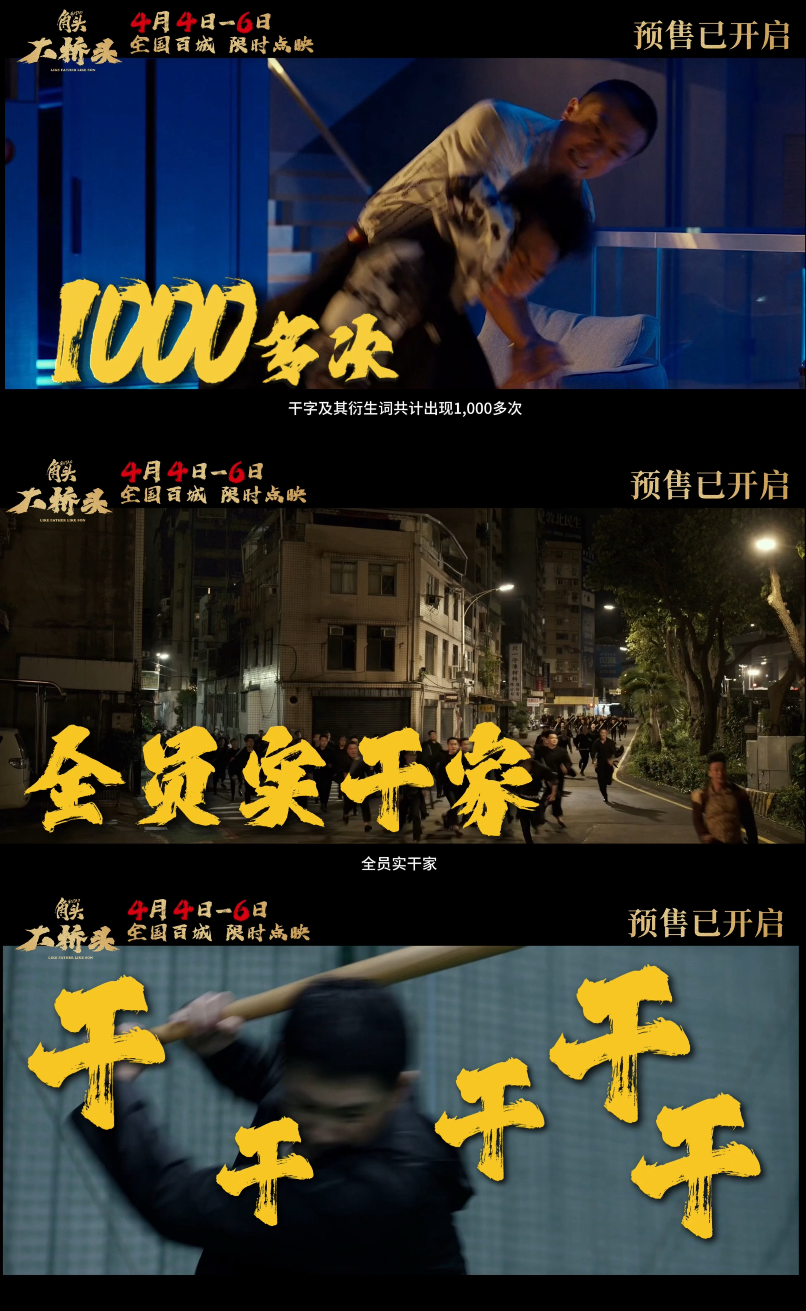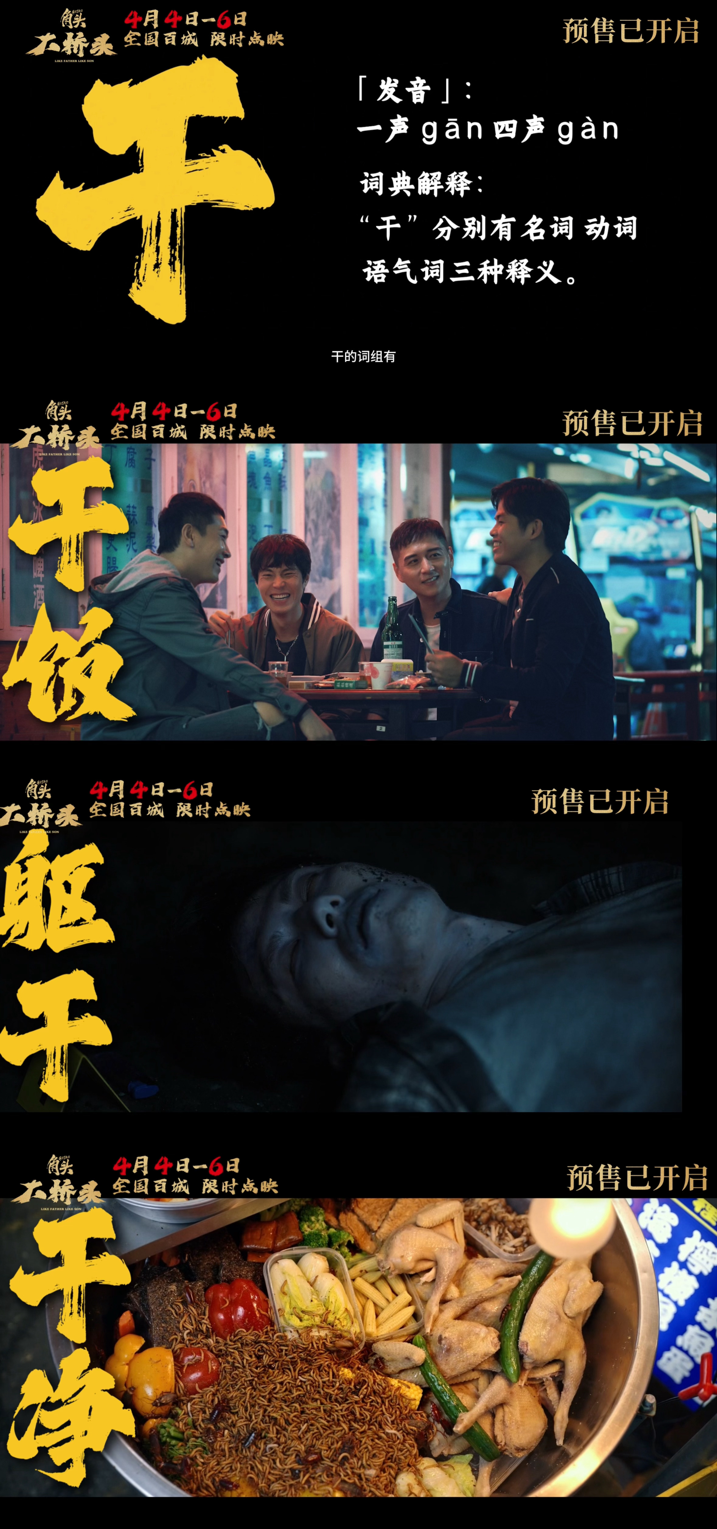 我每天就靠一个干字活着 有这身干劲干什么都像在干仗建议所有“嘴上没赢过”的人都来看看《角头:大桥头》的特别视频。感觉这片子根本不给你反应时间,台词光是含“干”量就1000+,每一句都像一巴掌扇你脸上,直冲冲就往咱脸上怼啊,肾上腺素直接拉满。去看了看之前主题观影的评论,大家都说无论是一句接一句的粗话还是棍棍到肉的群架戏都非常过瘾看得浑身舒爽,影片4月4日-6日全国百城限时点映,预售已开现在就能冲啦~我还看到了路演安排,期待王阳明和张怀秋hhhh,爱惨了他俩霸总和疯批忠犬的设定,线下请多多互动!等到4月10日,内地上映了我再去二刷~
