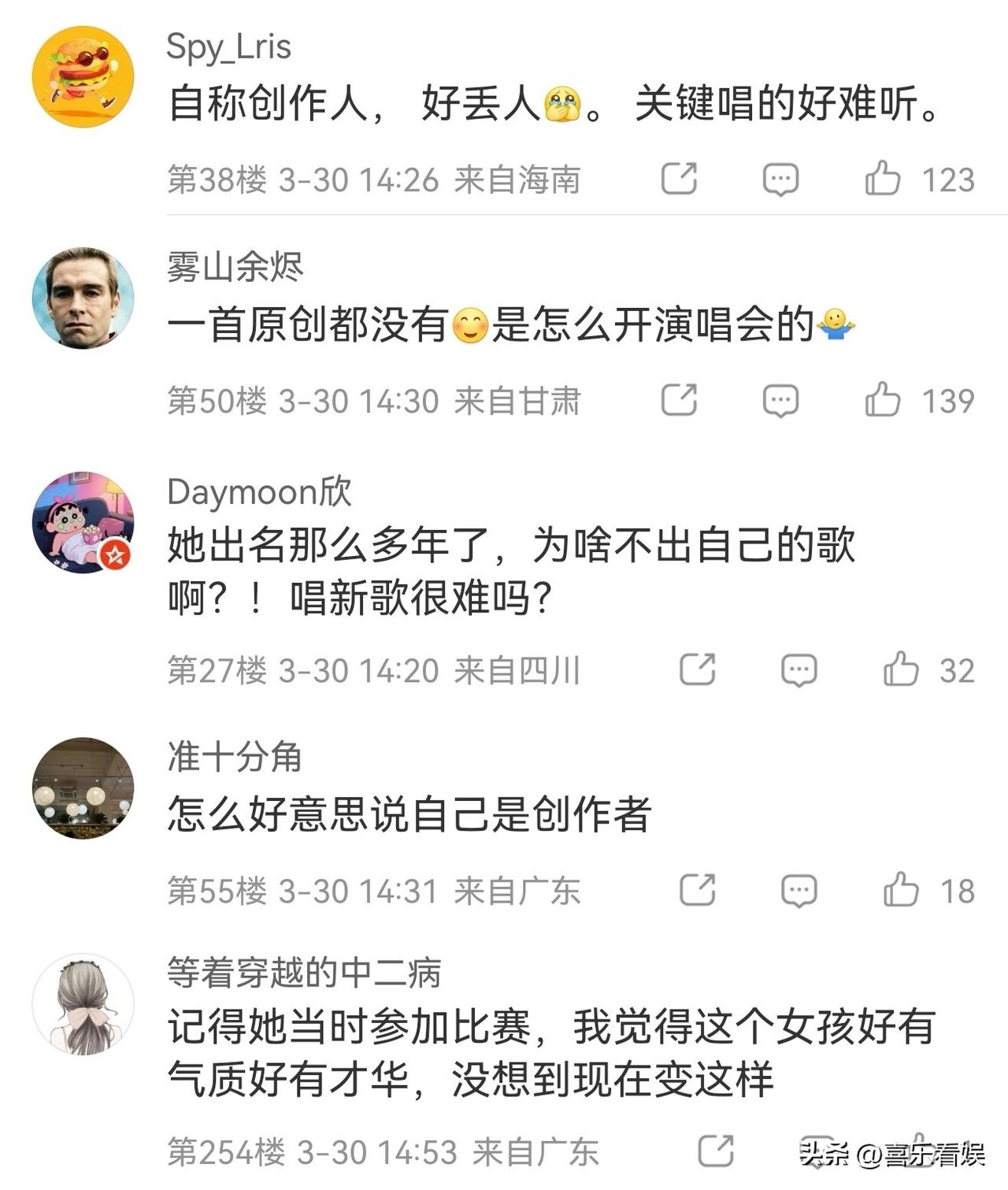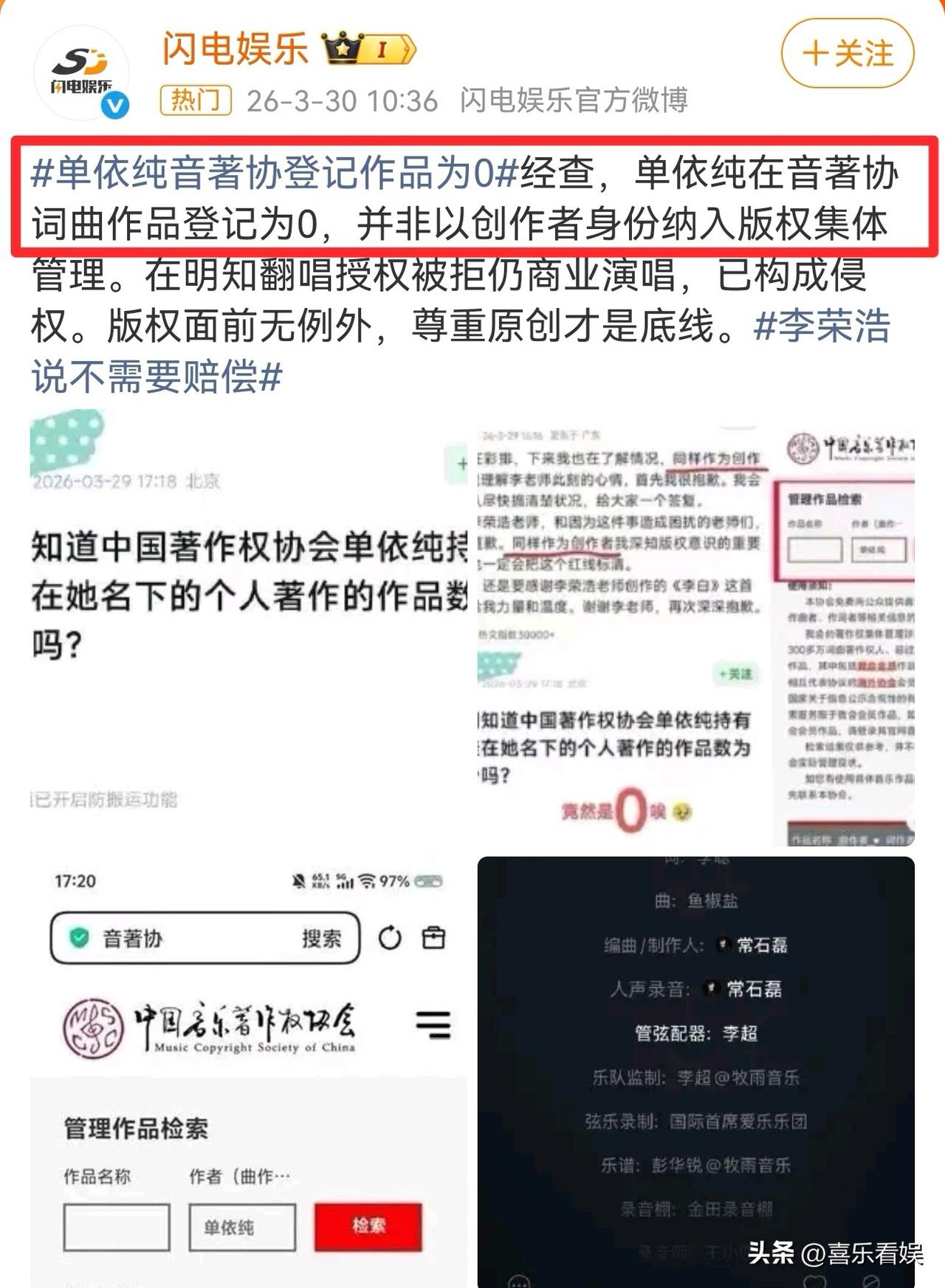 单依纯,这就真让人意外了! 3月30日,单依纯又又冲上热搜,这次的瓜属实有点打脸,说出来真的让人挺意外的,这到底是咋回事? 原来是有媒体查证了音著协的登记信息,结果显示单依纯名下的词曲作品登记数量居然是0,也就是说她根本不是以创作者的身份被纳入版权集体管理的。 更关键的是,她在明知翻唱李荣浩的歌被拒绝授权的情况下,还拿去商业演唱,这已经构成侵权了,不过李荣浩这边倒是大度,说不需要赔偿。 这事儿一出来,网友们直接炸锅了,吐槽声一片。 有人直言“自称创作人,好丢人”,还有人纳闷“一首原创都没有,是怎么开演唱会的”。 也有网友不解,她出名这么多年了,为啥一直不出自己的歌,唱新歌很难吗? 更有网友感慨,当初看她比赛觉得她有气质有才华,没想到现在变成这样,实在让人失望。 可以说,在此之前,单依纯在大家心目中的印象是实力派歌手,唱功好,还被贴上创作人的标签。 没想到,现在被扒出连一首原创作品登记都没有,还涉及侵权,这反差确实有点大。 版权这东西本来就是底线,尊重原创是最基本的,不管是谁都不能例外。 希望她能正视这个问题,好好搞搞原创,别再让喜欢她的人失望了。