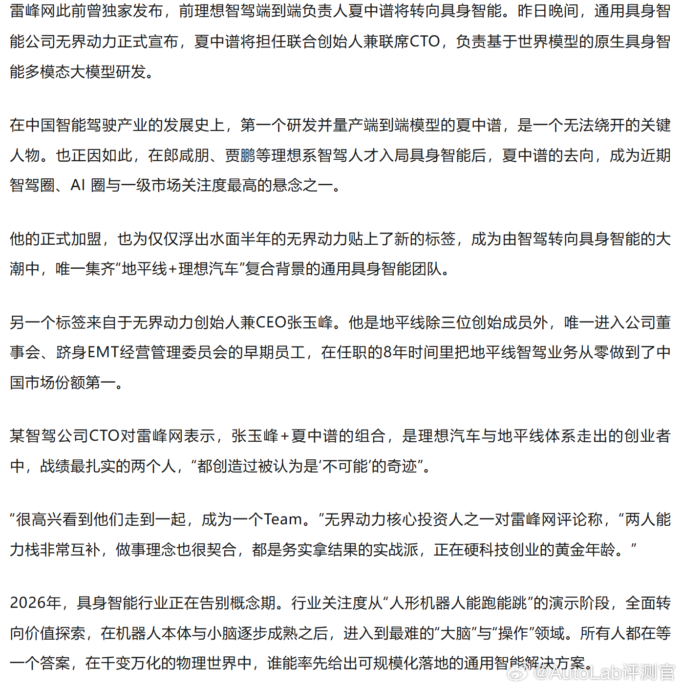 理想原来研发量产端到端模型的负责人夏中谱,和地平线副总裁张玉峰一起去做具身智能了