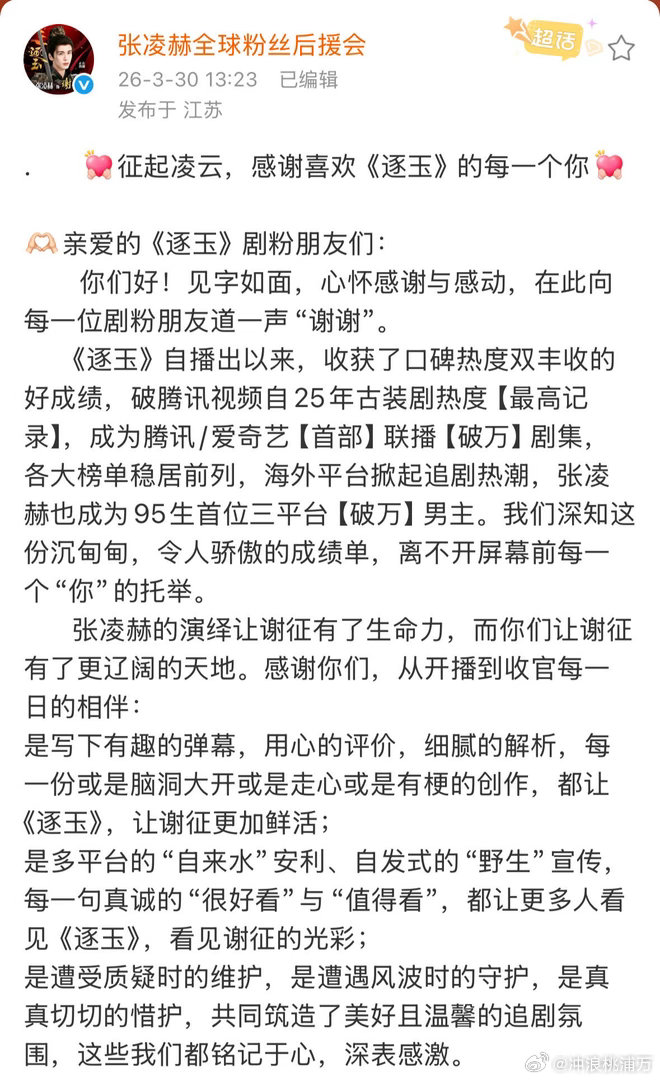 张凌赫全体粉丝致谢逐玉剧粉张凌赫粉丝后援会致谢逐玉剧粉张凌赫全体粉丝致谢逐玉剧粉了,呜呜呜呜第一次见到这么真诚的演员粉,评论区也都好暖心!居然还会专门发一感谢剧粉的,张凌赫跟小核桃们都好真诚啊!