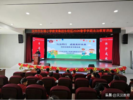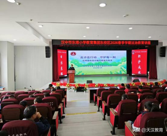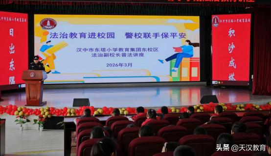3月26日上午,汉中市东塔小学教育集团东校区特邀汉台公安分局七里派出所副所长郝洁同志和学校法治副校长姚雪蕾同志走进校园,为全体学生开展法治专题讲座,围绕《预防未成年人犯罪法》、校园欺凌防治、电信诈骗防范三大核心主题,播撒法治种子,筑牢安全屏障。