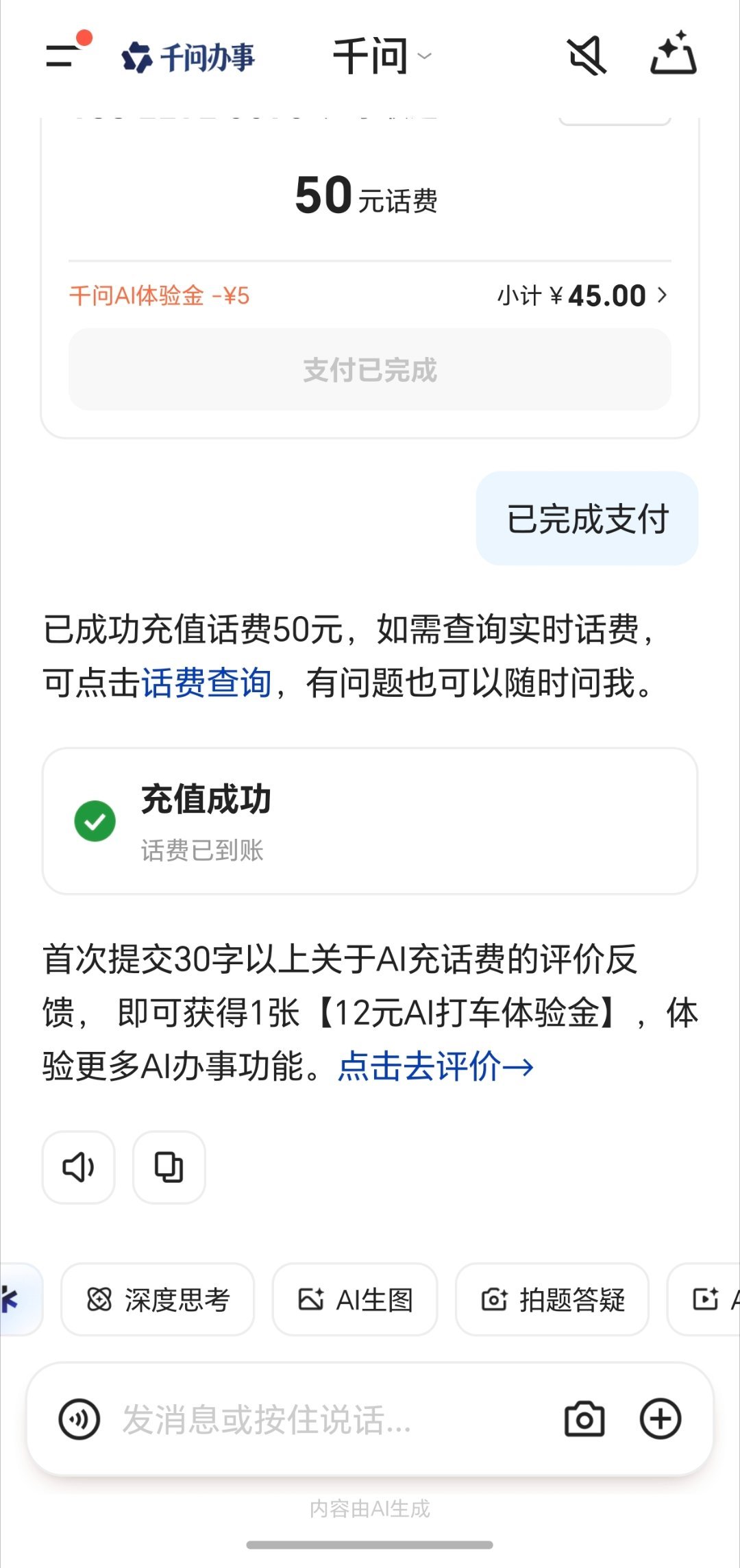 朋友们,千问的新一轮羊毛可以薅,充话费50-5。亲测有效,速度可以,很快到账。App左上角的千问办事,领取5元AI充话费优惠券,然后就可以充。反正早晚也要充,这个优惠在充话费上面算挺大的了,薅它