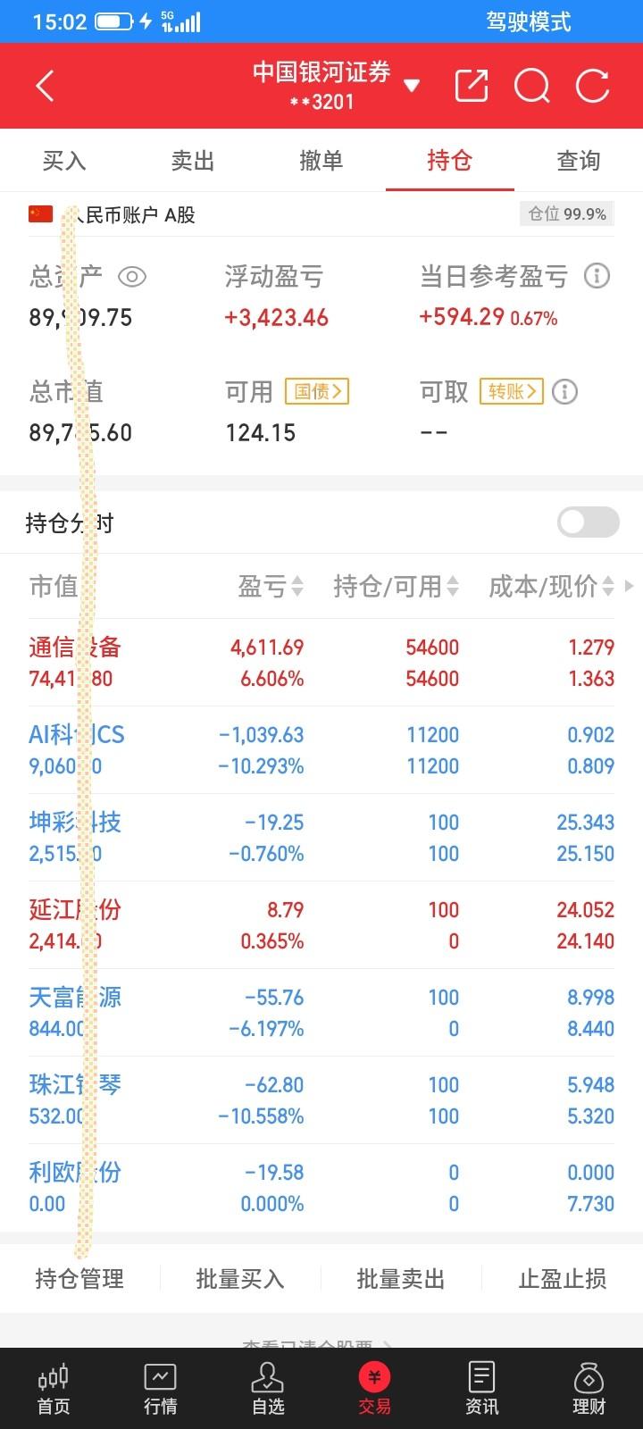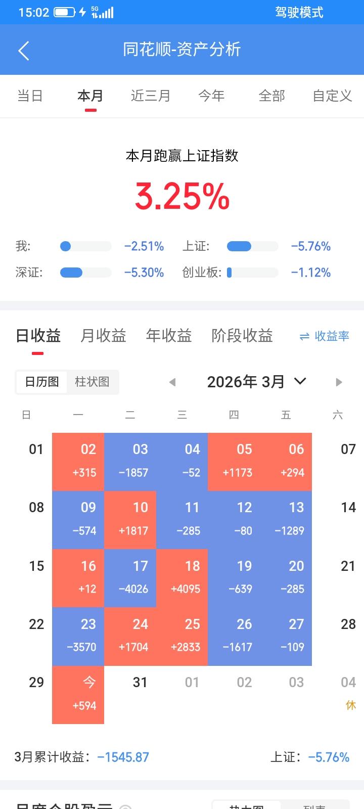2026.03.30,今天又是大幅低开低走,然后触底反弹,我又胆小了,又没有管住手,下跌中又主动止损了,但是卖掉的反弹上涨了,高开高走的,没有卖,反而冲高回落,不卖不涨,不买不跌,又都做反了。 星期五买入的利欧,低开低走,不断下跌,怕大跌,于是以7.52元止损卖掉,卖掉之后就不再下跌了,逐步反弹,又多亏了20块钱。 天富也是差不多,但是跌幅更大,大幅低开低走,下跌中以8.50止损卖掉100股,卖掉之后反弹了一点点,但是收盘还是跌下来了,下跌不多,可能又卖错了,收盘以8.44元买回来100股,又多亏了50多块钱。 看到延江反弹,于是回落中以24.05买入100股,买入之后还下跌了几分钱就反弹上涨了,但是浮盈一点点,收盘还是跌下来了,暂时浮盈几块钱。 坤彩真是坑人,大幅高开高走,最高冲到26.69元,再创新高,拉高了将近6个点,以为会涨停,但是又是拉高诱多,收盘不涨反跌,从浮盈一百多到倒亏了十多块钱,但是跌幅不大,也放弃红进绿出的原则了,还是不卖吧,也没有亏多少,再持有一天看看。 科创etf低开低走,然后反弹,收盘下跌了一点点,幅度太小,忽略不计,不操作。 通信设备etf大幅低开,再下跌了一点点,然后反弹上涨,想等到收盘下跌再买入,但是没有朝我预计的方向下跌,收盘反而上涨了一点点,又错过了一个波段,还是日K线网格交易,上涨了0.013元,收盘以1.363元卖掉1300股,赚16块钱。继续上涨继续卖,下跌再买回来。 今天开盘亏了一千多,收盘反而赚一点点,有惊无险,虚惊一场。今天总市值8.97万元,总资产8.99万元,贷款4万元,预估利息3天78块钱。今天总体账户从亏一千多,到收盘浮盈594元。这个月还亏了1600块钱,这个月回本无望了。明天最后一个交易日,只有通信设备etf大涨,这个月才能回本了,这个月股票亏了3000多,全靠etf回来一些,抵消了大部分亏损。下个月减少股票交易。集中资金做etf。