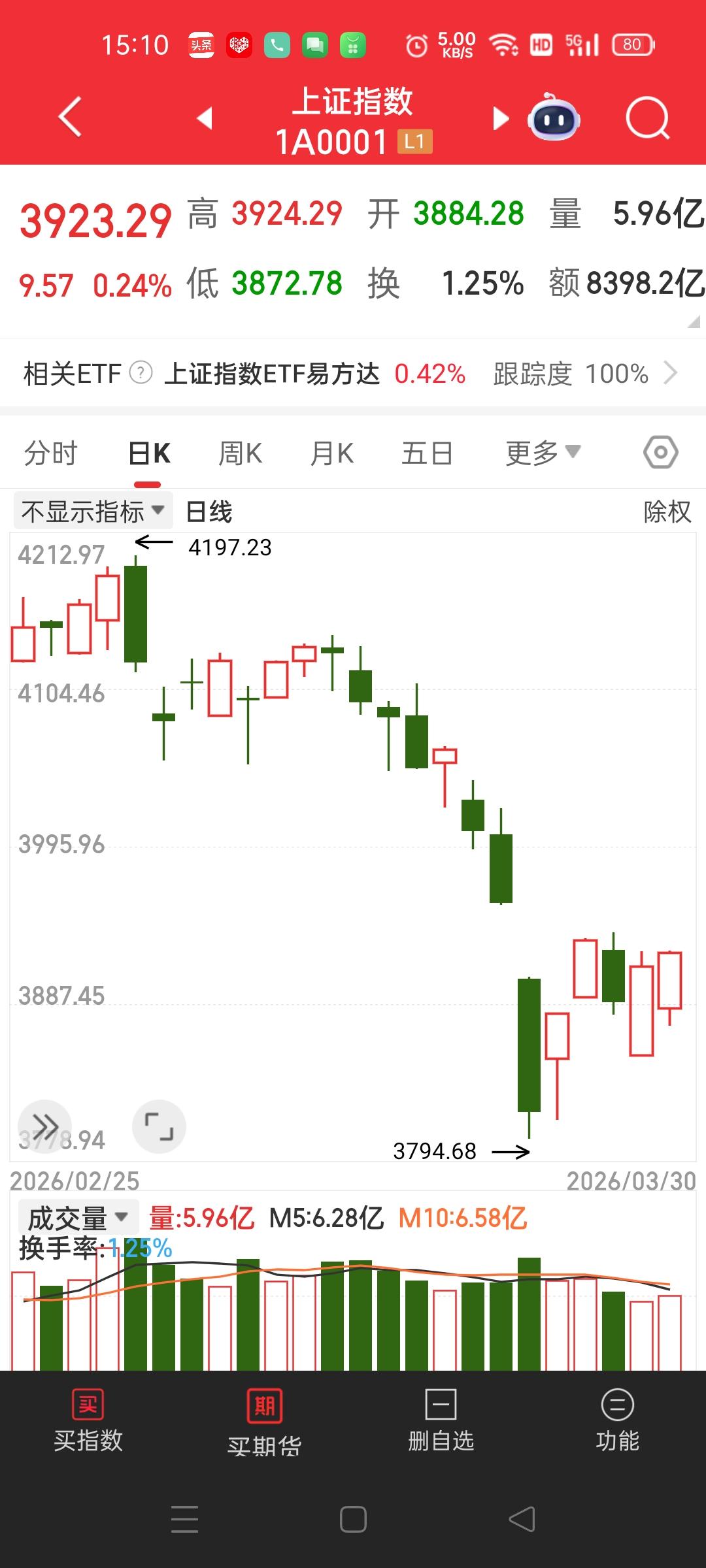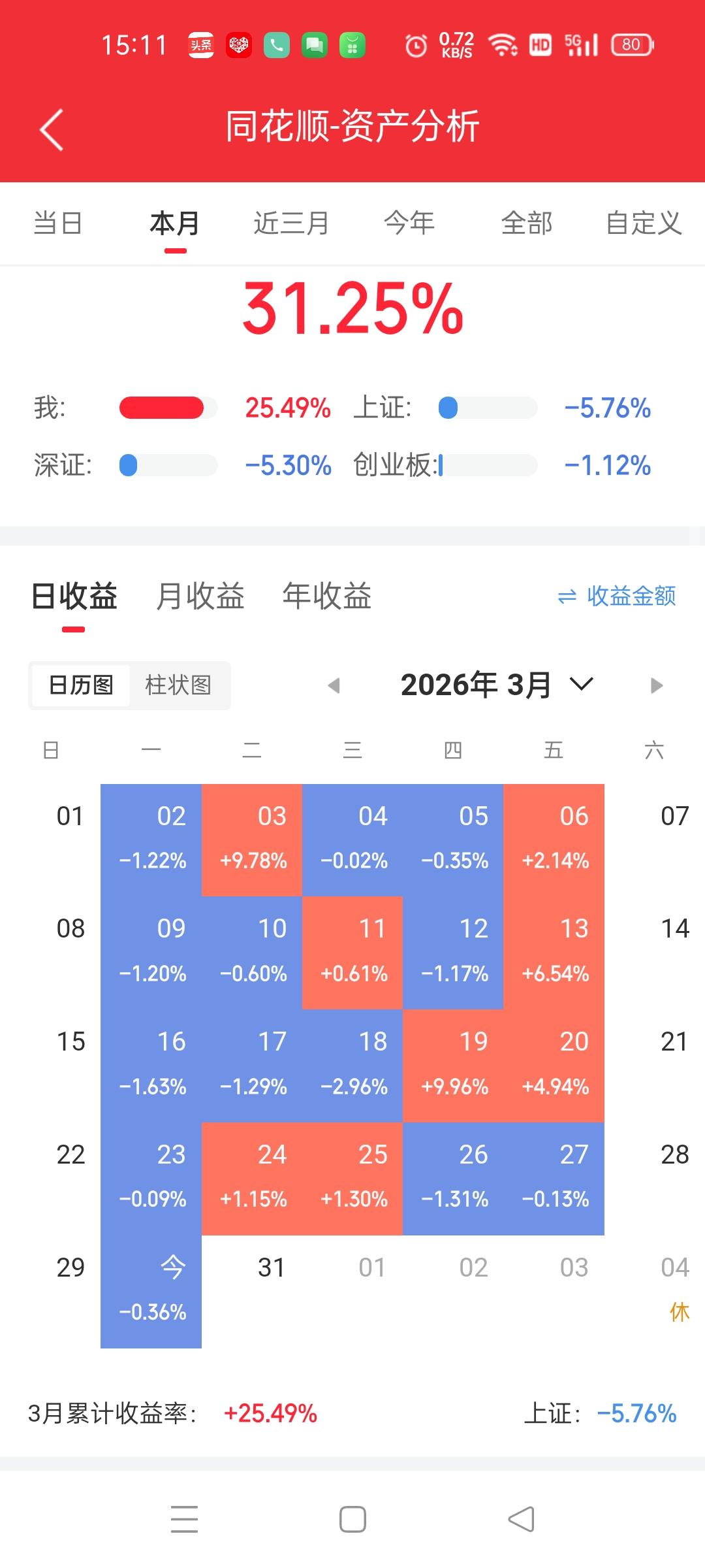 真是快崩溃了,大盘越涨我的票越跌,大盘越跌我的票越涨!真是反常! 前几天还挺有信心的,想着这个月是不是能挣10000块钱,看来梦想要落空了,因为这个月就明天最后一个交易日了,我还差3000多块钱才够1万元,除非明天有奇迹出现,明天这两只都涨停,否则是没戏了! 这天天搞来搞去的,一个礼拜下来,手里的盈利还是那么多,就是说这一个礼拜一分钱没赚到,这不是白玩了吗? 手里的两只票尾盘也没拉起来,上午还想着下午如果能拉起来,尾盘必须出掉,因为这两只都破位了。 再等等吧,看明天怎么样?反正不管哪只票,我是不会亏钱出来! 加油!祝自己好运! 祝大家都天天发财!