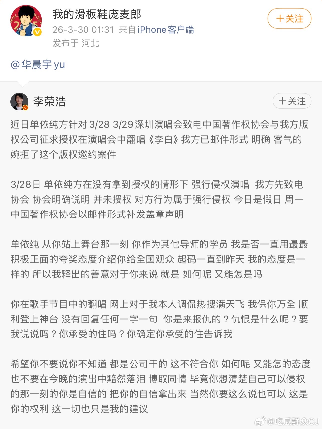 还是音乐圈能撕,庞麦郎今天凌晨转发了李荣浩开撕单依纯的微博,艾特华晨宇,意思是自己也没授权华晨宇商用《我的滑板鞋》。庞麦郎 华晨宇