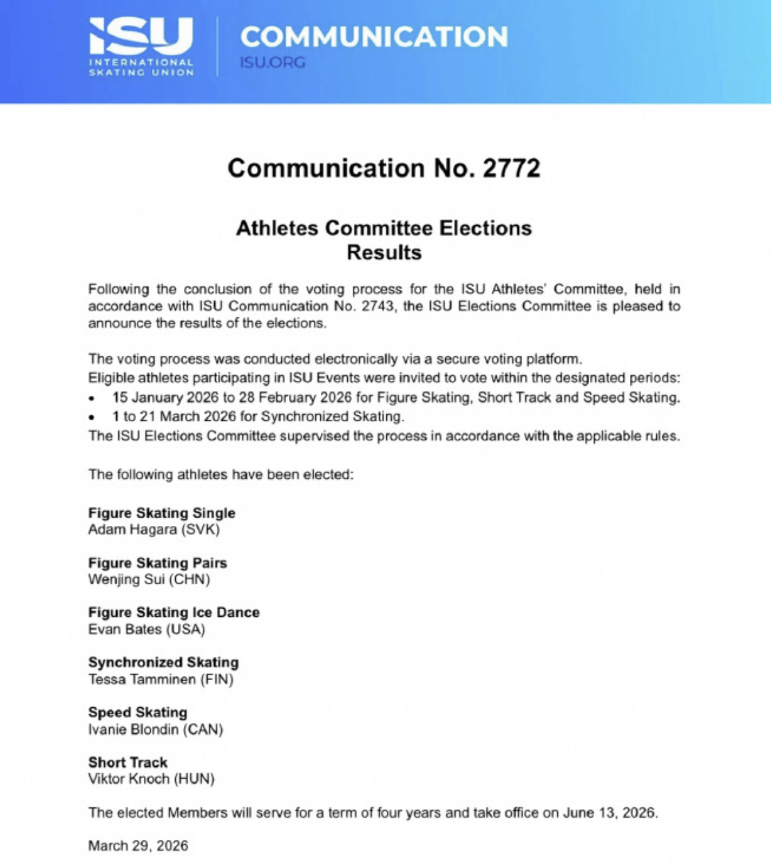 日前,国际滑冰联盟正式公布运动员委员会委员竞选结果,中国花样滑冰双人滑奥运冠军隋文静成功当选国际滑联运动员委员会委员。隋文静将于2026年6月13日正式履职,任期四年。