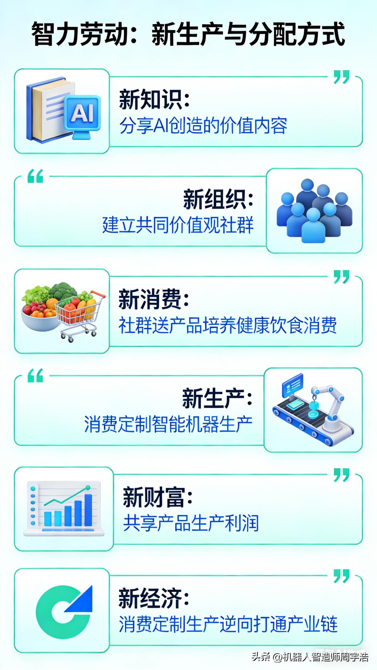 科技越发达,赚钱越简单! 马斯克说:未来工作不是因为生存需求而是兴趣爱好,因为AI取代人的脑力劳动,智能机器取代人的体力劳动,人类开始从事智力劳动:分享、链接和创新;分享AI创造出来的价值内容(新知识),找到有共同价值观的人建立社群(新组织),社群送产品培养健康饮食消费(新消费),消费定制智能机器生产(新生产),共享产品的生产利润(新财富),消费定制生产逆向打通产业链(新经济),这是新的生产和分配方式,人类摆脱现实社会中那种身不由己的宿命和无奈,开始去探索生命的意义和人生的价值!