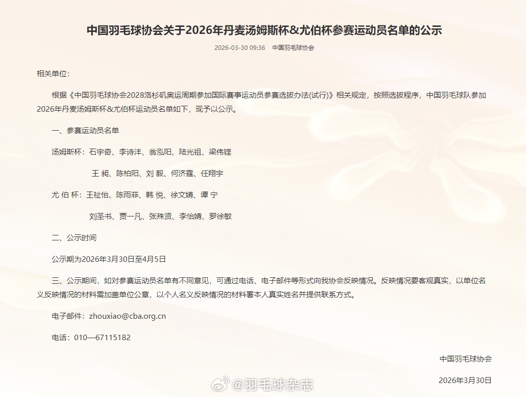 3月30日早上,中国羽毛球协会官网发布公告,对中国羽毛球队参加2026年丹麦汤姆斯杯&尤伯杯运动员名单进行公示。