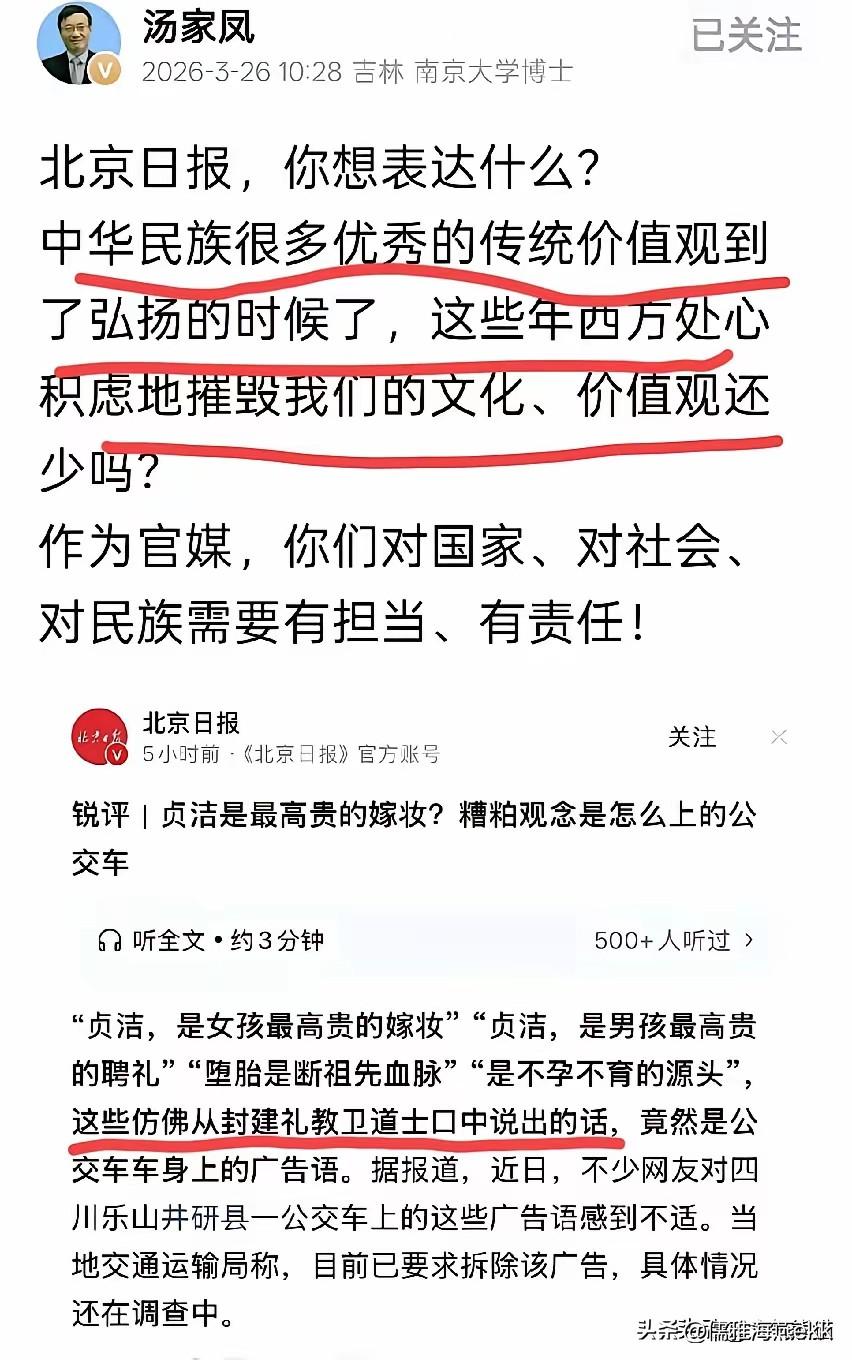 南大汤家凤教授就“贞洁”问题喊话某些媒体,并公开承诺:如果我的解读不符合社会主义核心价值观,我会连续30天向社会公开道歉,如果个别媒体解读不妥,得拿出态度。 关于乐山公交广告上的“贞洁是女孩最高贵的嫁妆,自洁是男孩最高贵的聘礼”,个别媒体认为是封建糟粕,汤家凤教授对此提出质疑,喊话某些媒体并公开作出承诺。 汤家凤教授说,个别媒体把公交车身上的“贞洁”广告直接定义为“封建糟粕”,甚至解读出“物化”含义,他认为这个“洁”是“洁身自好”的意思,他提出了不同的看法,也对个别媒体的解读提出质疑。 汤教授说,没想到“贞洁”在现在能引起这么大的反响。他认为这个问题非常重要,它关系到整个社会风气的导向和价值观问题,尤其对年轻人影响深远,不可小视。 他公开承诺,如果他的解读不符合社会主义核心价值观,引起社会纷扰,浪费社会资源,他将连续30天公开向社会道歉。如果个别媒体解读有不妥的地方,他希望媒体拿出态度,因为媒体是党和人民的喉舌,是弘扬正气的阵地,他作为一名民主党派,要尽自己的一份责任。 我觉得汤教授说得有道理,我们五千年传统文化是西方的所谓自由无法相比的,西方的X自由是践踏自己的身体,受伤害也只能自己承担,还殃及他人及家庭,如果想拥有健康的身体,幸福的家庭,就得洁身自好。 贞洁不应该是糟粕,自爱更不是封建!