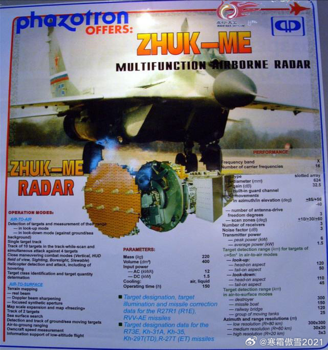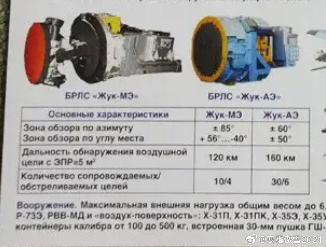 军事ai新视野烽火问鼎计划武器装备 苏35SM新雷达型号辨认和参数分析➡️图1看边条的确不可能是米格35,UAC航展展示了苏35最新的雷达升级方案,从雪豹E半A半P雷达升级为甲虫AE AESA。雷达型号判断看图2VS图3,图4证明甲虫ME雷达探测5平方米目标120KM、甲虫AE雷达探测5平方米目标160KM,这款雷达也被用于图5的苏75战机(展板证明也是160KM探测RCS=5目标),综合看略逊色探测2平方米目标160KM的AN/APG83雷达,但比2014年展出的用于枭龙的KLJ7A探测5平方米目标150KM强一点(图6)。➡️甲虫系列(音译祖克)雷达是NIIR产品,该公司是苏联时期唯一正经研究平板缝隙天线的企业,图7~图9分别为甲虫A(用于米格29M)、甲虫ME(用于印度米格29K)、甲虫MSFE(原计划用于中国退货的苏30MK3),最终由平板缝隙雷达衍生出的AESA就是甲虫AE雷达(图10),另一个从KLJ7平板缝隙雷达衍生出AESA的是14所的KLJ7A雷达(图6)。➡️NIIP产品则是苏27倒卡雷达这支科技树跳过了平板缝隙天线(苏联加工精度不足难以批量生产PD),直接选择当时成本有优势探测威力比倒卡大的PESA(N011M 图13,对5平方米目标探测135KM),后采用部分AESA后端拼接减少PESA回波信噪比损失,衍生产品为No35雪豹E雷达(图14,对5平方米目标探测270KM,图16乌克兰方面证明苏35探测苏27约270KM),最终换掉PESA的行波管发射机改成纯AESA No36松鼠雷达(图15,参数不明,发射机分散了功率,探测距离必然不如雪豹E,估算为探测5平方米目标不超过220KM),NIIP产品进化看图12。⭐️苏35SM如今从NIIP产品更换为NIIR产品,无疑是NIIR多年被同行压制后的反击,但160KM的AESA雷达还是不如NIIP松鼠雷达,大概率需要放大根据雷达罩直径估算大约最终与松鼠雷达接近也能达到205KM水平,虽然最大探测距离不如早期苏35,但抗干扰比早期苏35强,可能苏35SM在俄军体系里当苏57低配使用。俄军自用苏35与目前外贸用户使用的苏35相比,最大升级是采用了9B1103M2 AESA导引头的R77M,比外贸用户的R77-1强的多,大约相当于换AESA导引头的PL12AE。⭐️这意味着外贸用户的苏35不是真正的4.5、只有升级了AESA➕R77M的苏35SM才是真正的4.5,你买的降级版👈本博对R77M分析参考: 网页链接本博对雪豹E雷达探测威力分析参考: 网页链接 图11是AI做的苏35参数海报,翼展15.3米计算了希比内M吊舱宽度,去掉吊舱14.7米。