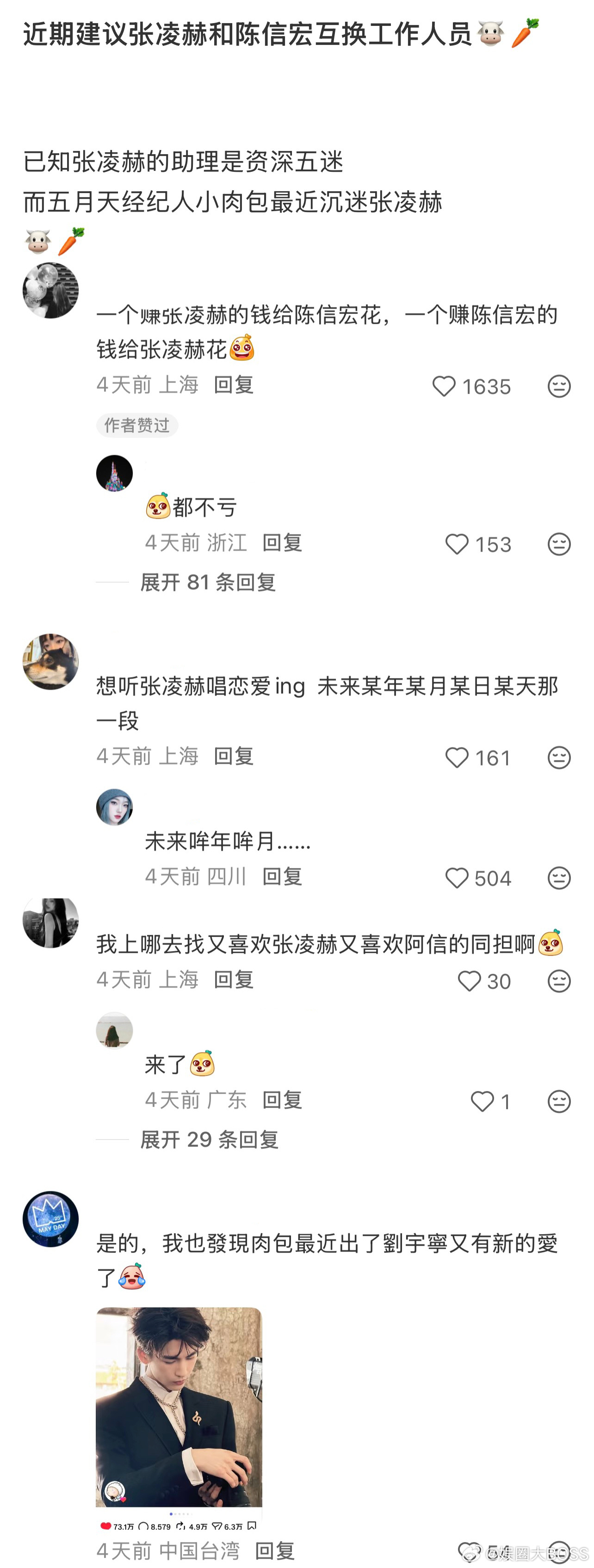 阿信助理点赞张凌赫建议张凌赫阿信互换助理 已知张凌赫的助理是资深五迷,阿信的助理小肉包最近沉迷张凌赫,一个赚老板的钱给另一位偶像花,一个沉迷于凌赫的美貌,网友都在建议张凌赫和阿信互换助理