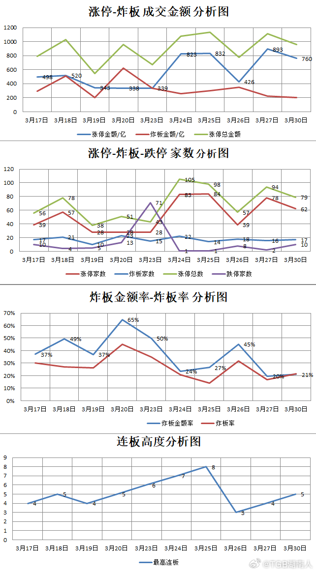 【3.30星期一】 湖南人涨停复盘 "涨停金额:760亿 炸板金额:202亿首板金额:613亿 连板金额:147亿涨停62家 炸板17家 跌停10家首板50家 连板12家" 【市场连板股】12只 147亿 代码 名称 末次时间 连板数 原因603538 美诺华 9:30 5 医疗医药002361 神剑股份 10:29 3 商业航天000890 法尔胜 9:34 2 光通信003042 中农联合 9:37 2 农业600488 津药药业 9:39 2 医疗医药603585 苏利股份 9:40 2 化工603618 杭电股份 9:49 2 光通信600513 联环药业 9:58 2 医疗医药600996 贵广网络 10:16 2 算力002432 九安医疗 14:22 2 医疗医药600539 狮头股份 14:27 2 算力002038 双鹭药业 14:55 2 医疗医药【光通信】9只 218亿 消息面:美股光通信龙头创历史新高;国内厂商发布NPO新品 000890 法尔胜 9:34 2 光通信603618 杭电股份 9:49 2/4天3板 光纤光缆002980 华盛昌 9:59 1 拟收购伽蓝特(光模块)002222 福晶科技 11:06 1 法拉第旋光片600487 亨通光电 11:24 1 空芯光纤600345 长江通信 13:00 1/4天2板 参股长飞光纤601869 长飞光纤 13:00 1/5天3板 光纤002309 中利集团 13:48 1/7天5板 光纤线缆603272 联翔股份 14:46 1/6天3板 资产注入预期(光芯片)【商业航天】9只 155亿 消息面:液体可重复使用火箭智神星一号将于近期实现首飞 002361 神剑股份 10:29 3 商业航天600343 航天动力 9:59 1 液体火箭发动机603017 中衡设计 10:31 1 商业航天001400 江顺科技 10:53 1/4天2板 航天3D打印300385 雪浪环境 11:11 1/6天3板 星间通信600135 乐凯胶片 13:19 1 航空遥感胶片603601 再升科技 13:52 1/4天3板 SpaceX供应商605222 起帆电缆 14:23 1 航空航天300900 广联航空 14:31 1 商业航天【医疗医药】9只 87亿 消息面:2026年中国创新药出海BD总包已达571亿美元;AACR年会将召开 603538 美诺华 9:30 5/12天7板 减肥益生菌+减肥药600488 津药药业 9:39 2 创新药600513 联环药业 9:58 2 心绞痛药通过一致性评价002432 九安医疗 14:22 2 间接参股月之暗面002038 双鹭药业 14:55 2/4天3板 减肥药/益生菌002675 东诚药业 9:25 1 核药002370 亚太药业 10:20 1 药兜网创始人入主预期688677 海泰新光 11:16 1 光学成像器械603716 塞力医疗 13:10 1 创新药【铝】8只 55亿 消息面:中东多国铝厂遭袭 002160 常铝股份 9:25 1 铝加工002578 闽发铝业 9:25 1 铝材002532 天山铝业 9:25 1 一季度预增+氧化铝601068 中铝国际 9:31 1 冶金技术(电解铝)002686 亿利达 9:37 1 汽车铝合金002501 利源股份 9:45 1 工业铝型材601388 怡球资源 11:17 1 再生铝600219 南山铝业 14:54 1 铝加工产品【机器人】5只 34亿 消息面:上交所受理宇树科技IPO申请 003036 泰坦股份 11:11 1 电子布上游603358 华达科技 13:52 1 股东增持+机器人603897 长城科技 14:05 1 人形机器人(线束)000048 京基智农 14:19 1 成立机器人公司603239 浙江仙通 14:54 1 布局机器人【福建】3只 63亿 消息面:中国国民党主席郑丽文将率团访问大陆 000592 平潭发展 10:49 1/4天2板 两岸统一000753 漳州发展 13:42 1/4天2板 海峡两岸603122 合富中国 13:44 1 海峡两岸双上市【农业】3只 7亿 消息面:化肥短缺可能导致农作物产量降低 003042 中农联合 9:37 2 农药600127 金健米业 9:34 1 大米600359 新农开发 10:06 1 农业种植【业绩增长】3只 24亿 600502 安徽建工 9:30 1 新兴业务合同增逾八成002850 科达利 9:32 1 年报增长002810 山东赫达 9:54 1 一季报预增【算力】3只 44亿 消息面:全国首个万卡级全栈自主可控智算集群点亮 600996 贵广网络 10:16 2 算力600602 云赛智联 10:35 1 算力租赁【光伏】 002634 棒杰股份 13:15 1 光伏N型电池603778 国晟科技 13:20 1 太空光伏(未证实)【其他个股】 301008 宏昌科技 9:31 1 参股张雪机车603585 苏利股份 9:40 2 溴素688693 锴威特 9:43 1 拟收购晶艺半导体603016 新宏泰 10:58 1 资产注入预期603256 宏和科技 11:12 1 玻璃纤维布603061 金海通 11:21 1 存储设备000008 神州高铁 13:20 1 轨道交通600724 宁波富达 13:30 1 地产600539 狮头股份 14:27 2/5天4板 消费【涨停炸板】17只 202亿 代码 名称 首次时间 涨跌幅 原因688156 路德科技 14:53 19.96% 大农业688308 欧科亿 9:25 19.40% 公告600955 维远股份 9:33 10.03% 化工600152 维科技术 9:44 8.73% 其他600598 北大荒 9:36 8.37% 农业600746 江苏索普 9:37 7.75% 化工603159 上海亚虹 10:12 7.71% 其他600528 中铁工业 13:00 7.47% 其他002788 鹭燕医药 10:14 7.22% 脑科学603356 华菱精工 9:34 6.99% 光伏600398 海澜之家 10:15 6.73% 公告601952 苏垦农发 9:44 6.18% 大农业002082 万邦德 9:32 5.41% 医疗医药600423 柳化股份 9:38 5.33% 公告600844 金煤科技 9:25 4.21% 化工600121 郑州煤电 9:33 2.90% 其他600310 广西能源 9:30 -4.24% 智能电网