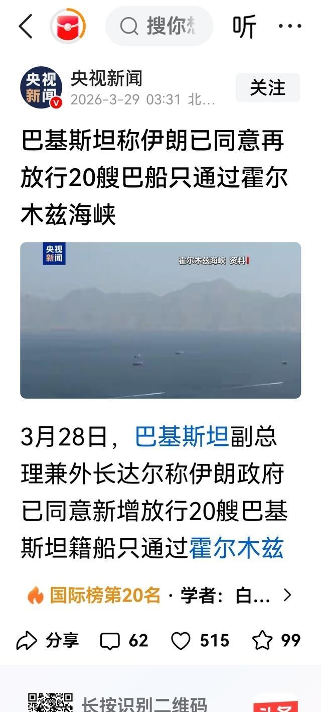 在沙特的默许下,巴基斯坦正在成为伊朗有关封锁霍尔姆斯海峡问题上的国际发言人。据说是伊朗给沙特面子,倒不如说是给巴基斯坦背后大哥的面子。现在已经有人开始把霍尔木斯海峡问题与当年炮击海峡问题联系在一起,甚至说这是此次中东战争的重大转折点,其实一点都不为过。在人类发展进程中,东方智慧已经不止一次打的美帝满地找牙,这次的结局也不会例外。 2026年2月底美以对伊朗发动军事打击后,伊朗迅速控制了霍尔木兹海峡,对参与敌对行动的船只实施限制。这个海峡是波斯湾通往外界的咽喉要道,每天正常情况下有大量石油和天然气从这里运出,影响全球能源供应。伊朗方面明确表示,海峡不是完全关闭,只是针对敌人和他们的盟友关闭,而对中国、俄罗斯、巴基斯坦等友好或非交战国家的船只,可以通过协调安排安全通行。这种做法让航运量大幅下降,全球油价出现明显波动,很多依赖海湾石油的国家都感受到压力。 巴基斯坦在这个过程中逐步发挥了协调作用。3月28日,巴基斯坦副总理兼外长伊沙克·达尔在社交平台发文,宣布伊朗同意额外放行20艘悬挂巴基斯坦国旗的船只通过海峡,每天安排两艘通行。达尔把这个安排描述为建设性姿态,有助于地区稳定。之前伊朗外长已经公开提到,巴基斯坦等国的船只可以安全通过,这让巴基斯坦自然承担起传递信息的角色。沙特阿拉伯在整个事件中保持相对低调,没有直接卷入对抗,而是通过现有管道调整部分原油出口,减少对海峡的完全依赖。外界观察认为,伊朗的这些让步既考虑到海湾国家包括沙特的能源出口需求,也顾及巴基斯坦与更广泛国际力量的联系。 巴基斯坦和沙特有长期的防务合作基础,双方签署过共同战略防御协议,这让巴基斯坦在地区事务中位置比较特殊。伊朗在处理海峡问题时,考虑到沙特的实际关切,通过巴基斯坦这个渠道来体现灵活性,比直接给沙特面子更像是在平衡更大范围的关系。巴基斯坦本身也依赖进口石油,海峡中断直接影响它的能源安全,所以它积极推动部分船只通行,既保护自身利益,也在地区间起到缓冲作用。美国那边倾向于组建护航联盟并施加压力,想通过军事或联盟方式重新打开海峡,而巴基斯坦则强调对话和外交协调,这种路径差异很明显。 现在不少人把当前霍尔木兹海峡的局势和上世纪80年代两伊战争时期的油轮战争联系起来。那时候交战双方攻击商船,海峡航运风险大增,船只经常被袭击或布雷,导致保险费用飙升,航运公司避开风险路线。这次海峡被有效控制,航运量降到很低水平,比当年油轮战争的干扰还要严重,直接冲击全球能源链条。有人说这是中东战争的重大转折点,不是没有道理,因为海峡问题把经济压力摆到台面上,迫使各方不得不考虑外交出路,而不是只靠军事手段。伊朗通过选择性放行船只,显示它有能力掌控局面,同时也给谈判留出空间。 巴基斯坦在3月29日主办了外交部长级会议,邀请沙特、土耳其和埃及代表参加。会议重点讨论海峡重新开放的步骤,包括船只协调机制和安全保障措施。巴基斯坦把一些建议转达给华盛顿,内容围绕恢复海上交通。伊朗继续根据非敌对标准允许有限船只通行,同时拒绝美国提出的全面开放要求。沙特则加大通过红海管道的出口量,每天输送数百万桶原油,缓解部分压力。全球油价因为中断出现波动,但随着巴基斯坦等国船只逐步放行,市场紧张情绪有所缓和。 整个过程里,巴基斯坦维持了调解立场,没有直接参与军事行动。它利用自身与美国和伊朗的关系,传递信息,推动有限的信任建立措施。这种做法符合东方处理国际事务的习惯,注重统一战线和多边协调,而不是单纯拉帮结派。美国搞联盟施压,而地区国家通过巴基斯坦这样的中间渠道寻找务实出路。历史上有过类似情况,东方智慧在面对强权时,往往通过灵活的外交和实际合作来应对压力,多次让局面出现转机。这次霍尔木兹海峡事件也不例外,巴基斯坦的角色让封锁出现缺口,也让各方看到对话的可能性。 巴基斯坦的做法让它在地区外交中位置更突出,也体现出通过对话处理危机的可行性。东方在人类发展中积累的经验,就是在类似局面下,不靠单方面施压,而是寻找共同利益点,推动事情往前走。这次事件再次说明,智慧的协调往往比直接对抗更能带来实际结果,结局也会朝着稳定方向发展。