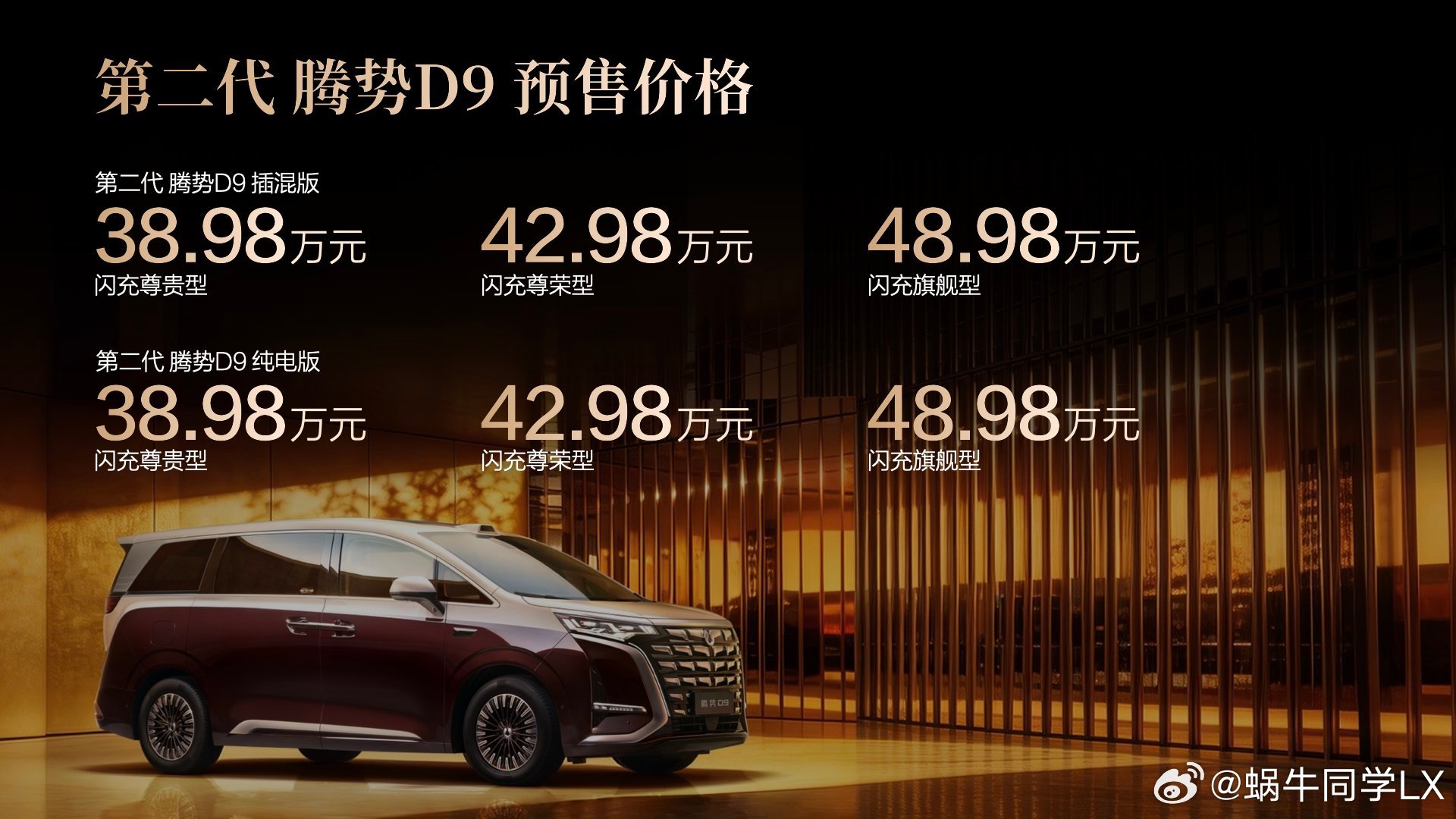 3月29日,比亚迪第二代腾势D9已正式开启预售。新款尺寸为5250×1960×1900mm,轴距3110mm,共六款配置,预售价格38.98万-48.98万元,且插混与纯电同价。