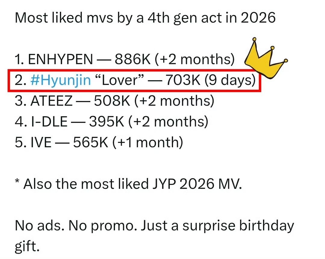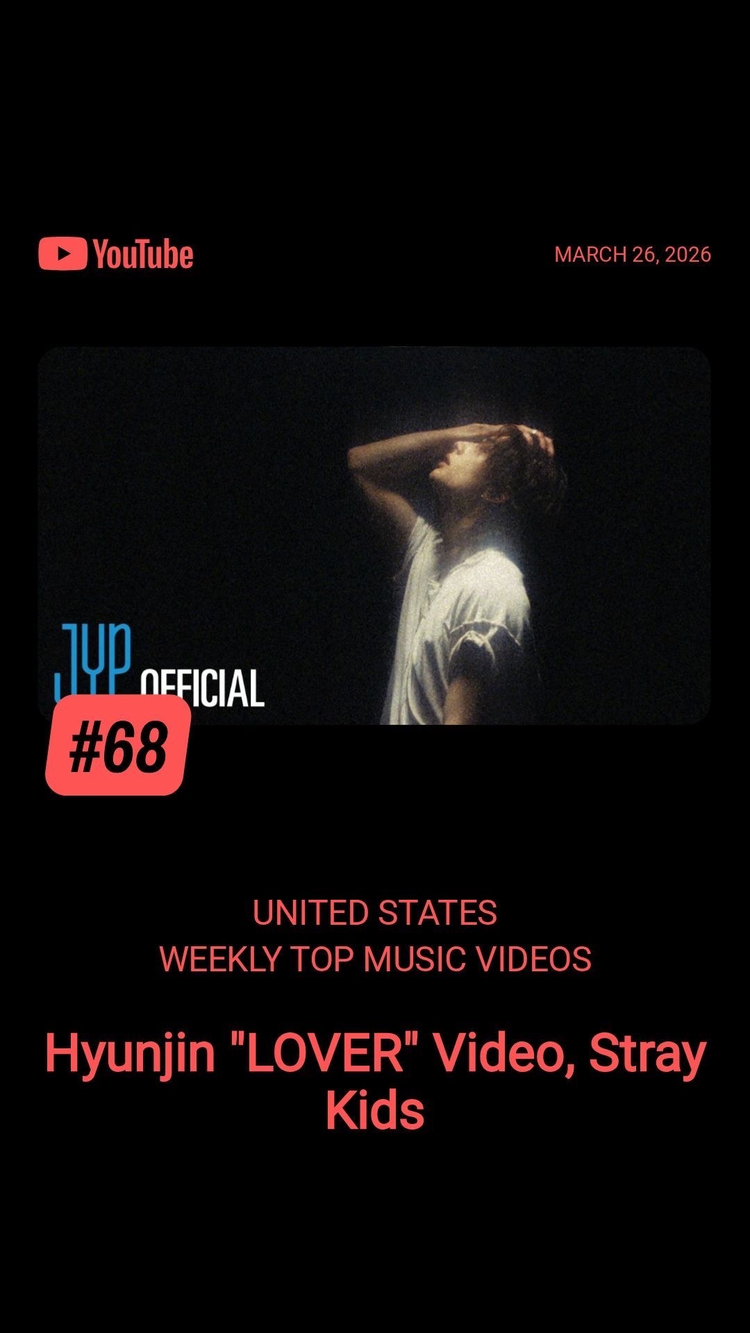 黄铉辰的自作曲Lover在YouTube平台登上美国每周热门音乐视频排行榜🔥无任何宣发纯生日当晚空降,是五代不分男女首位且唯一个人作品登上该排行榜的爱豆🥇同时也是JYP 2026年点赞量最高的MV👍🏻70.3万 (发布仅9天)