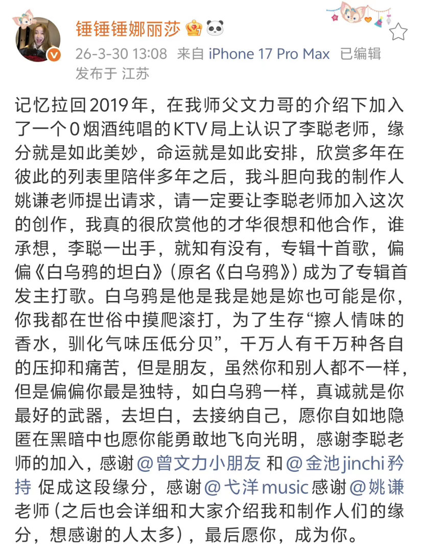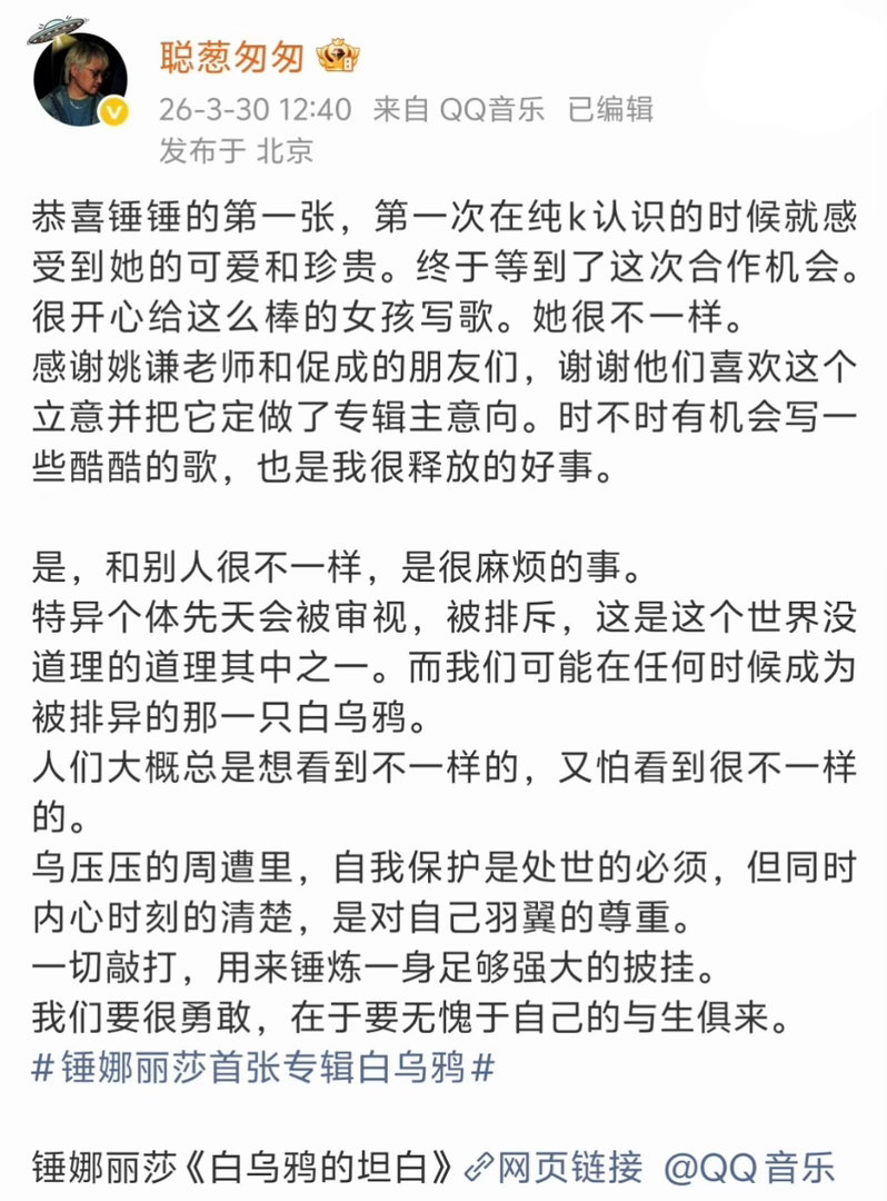 锤娜丽莎新歌和珠玉是同一作词人锤娜丽莎新歌居然是珠玉作词人写的李聪老师的词永远这么懂听众!锤娜丽莎《白乌鸦的坦白》和《珠玉》同属他的作品,一个是关于自我突破的呐喊,一个是关于情感的细腻描绘,风格迥异却都质量上乘,这次和锤锤的合作更是把歌曲的质感拉满,只能说,这波入股不亏!