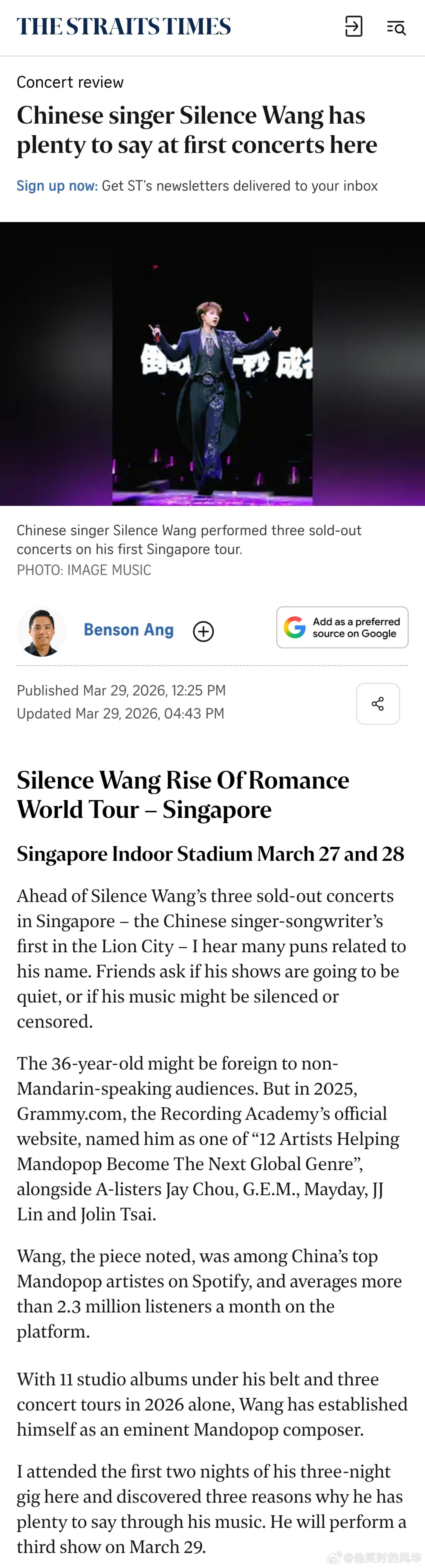 汪苏泷首次世巡登上新加坡报道汪苏泷世巡登报《海峡时报》整版报道汪苏泷世巡,认可其旋律创作、OST国民度与对年轻人的表达,非英语歌手获此认可格外难得。