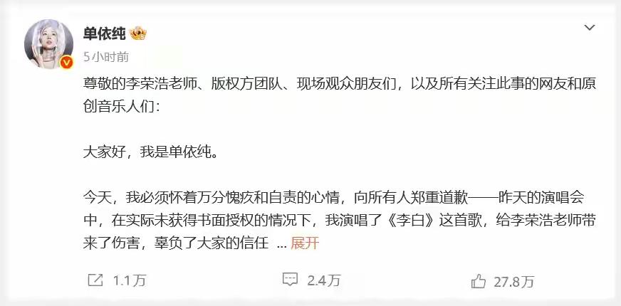 今天看到了李荣浩发文怒斥某女明星的文章,我都震惊了,再明确拒绝的情况下,不顾法律法规的约束,硬要唱别人的作品,这是多么无耻和下作的行为啊,这种人品没有底线的玩意到底是谁再捧它啊? 在我看来,去年这个女明星就因为翻唱了李荣浩的《李白》引发了巨大争议,吃了不少红利,所以这一次在李荣浩明确拒绝的情况下,它不顾及法律法规,为了红和流量没有底线的利用别人的作品,企图再次吃流量达到自己咖位升级的小心思,这种人简直就是太恶心了,太没有底线了! 刚刚看到它的道歉声明,在我看来这些都是写好的剧本,利用李荣浩的作品引发争议和关注,然后道歉把姿态摆出来,反正道歉也不会少块肉,倒是把热度和流量都拿到了!它的粉丝还会认为李荣浩和谴责女明星的网友小气,这种套路太常见了,捍卫自己权益的李荣浩和支持正义的网友反而成就了这个卑鄙无耻没有下线的女明星,真的是倒反天罡无法无天,看不下去了! 我最后希望有关部门必须要保护版权,封杀这类整天靠争议和没有底线的女明星,它们只会拉低年轻人的下线,简直太恶心了,这种玩意必须封杀!