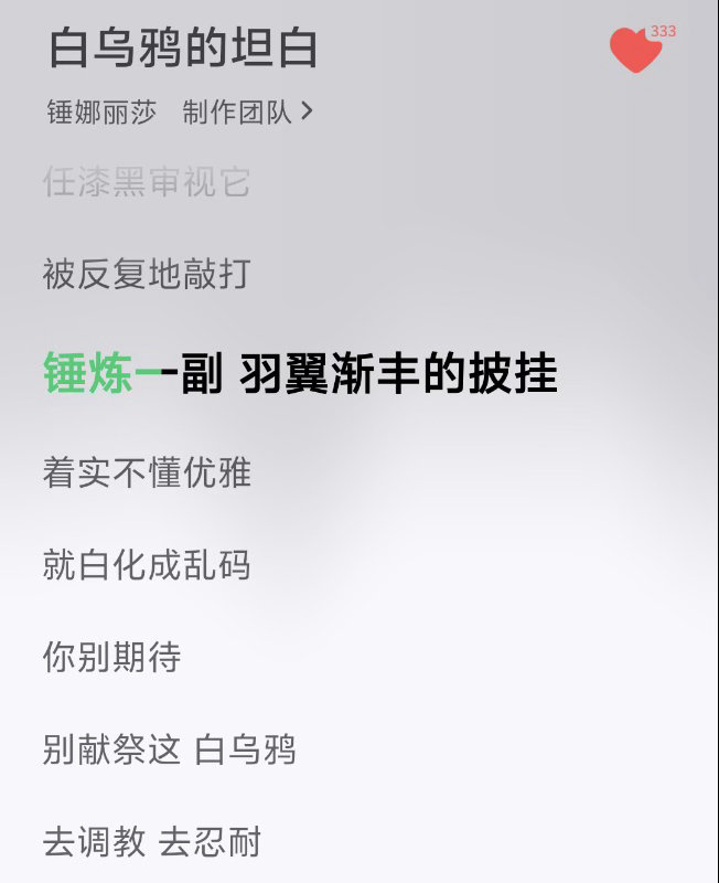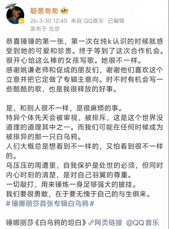 锤娜丽莎新歌和珠玉是同一作词人 锤娜丽莎新歌居然是珠玉作词人写的 谁橙想啊!锤娜丽莎新歌《白乌鸦的坦白》居然和《珠玉》是同一个,都是李聪!真的特别会写!“任漆黑审视它,被反复地敲打,锤炼一副羽翼渐丰的披挂”真的很震撼好吗!贴合专辑挣脱标签、肆意生长的内核,再叠加姚谦和整个团队的专业,配上锤娜丽莎自带情绪共鸣的唱腔。文字有深度,歌声有力量,buff加加加!