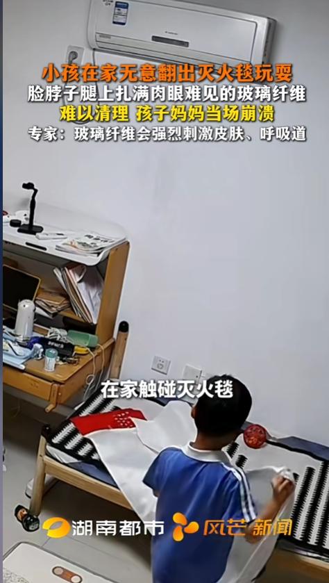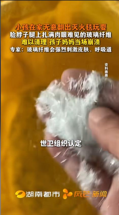 “天塌了!”近日,广东,一男孩在家里,无意间翻出消防发的灭火毯,展开看了看就又叠回去了。没想到就这一两分钟,身上就扎满了玻璃纤维,家里沙发上也到处都是,不少东西都不能要了。家长给清理了两天也没能彻底清除。网友:太危险得收好! 据媒体3月29日报道,这个灭火毯是消防发的,就一直放在柜子上,家里人也没想到竟然是玻璃纤维的。事发当天,孩子好奇,就拿了过来,搁沙发上打开,拿着转了一圈就又叠回去了。整个过程也就一两分钟。 没想到就这点短短的时间,孩子的身上扎满了,有些肉眼都分辨不出来。孩子的家长一见,天都塌了,赶紧想办法清理。胶带也用了,面膜胶也用了,给他清理了几个小时,最后又拿水洗了洗,还是没能彻底清理干净。 不仅如此,家里的沙发,玩具有不少也都沾了上,成了新的污染源。不得已,家长只能仔细分辨,把沾染多的全部扔掉了,少的那部分全部洗了洗,也不知到能不能洗干净。 好在孩子暂时没有什么事,第二天就能正常玩耍了。他身上肯定还有一些没清干净的,只能等慢慢代谢出来。好在没有引起明显的刺激反应。 专家提醒,玻璃纤维能刺穿皮肤,进入人体,还有很多颗粒较细的,会随着呼吸进入人体肺部深处。虽然其中的绝大部分,会在1-3个月内被人体代谢,但仍会刺激到皮肤和呼吸道。 家里含有玻璃纤维的制品一定要收好,放在孩子碰不到的地方。同时也要给孩子做好科普教育,哪些东西不能碰,不要让孩子因好奇酿成悲剧。如果不幸接触了,一定要及时进行清理,并且到医院进行检查! 信息来源:《小孩在家无意翻出灭火毯玩耍 脸脖子腿上扎满肉眼难见的玻璃纤维 难以清理 孩子妈妈当场崩溃 专家:玻璃纤维会强烈刺激皮肤、呼吸道》风芒新闻
