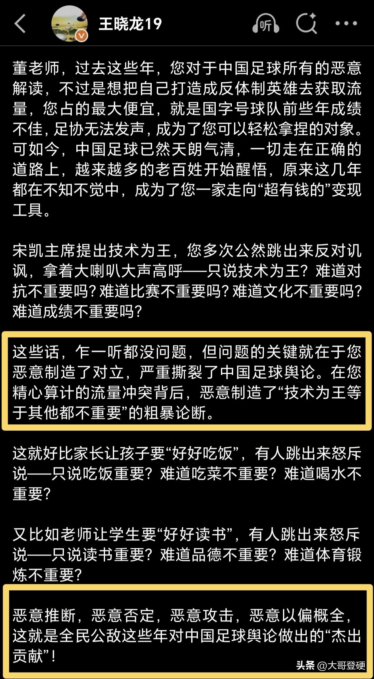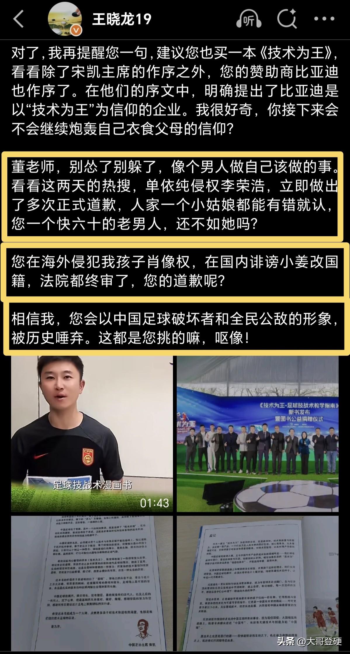 前国脚王晓龙再度发炮,标题《恶意解读技术为王,董老师已成中国足球公敌》⚠️ 北京时间3月30日,前国脚王晓龙在其个人社交媒体上再度向董老师发炮,措辞尖锐,堪比足球场上的各种飞踹[震惊] 王晓龙表示,由前国脚宗磊撰文,足协主席宋凯和比亚迪分别作序的《技术为王》一书,正式出版发行了,在发布会现场多位前国脚登台力挺,在视频祝福里,几乎大半个中国足球圈都在大力推荐这本书[赞] 王晓龙认为,足协主席宋凯提出技术为王,董老师多次公然跳出来反对讥讽,恶意制造对立,严重撕裂中国足球舆论…… 王晓龙用四个“恶意”来总结归纳董老师,即:“恶意推断,恶意否定,恶意攻击,恶意以偏概全”,这就是全民公敌这些年对中国足球舆论做出的“杰出贡献”! 最后,王晓龙建议董老师也买一本《技术为王》看看,顺便提醒一下董老师,在海外侵犯王晓龙儿子肖像权,在国内诽谤未成年人姜景祺更改国籍,法院都终审了,道歉在哪里?[what] 不得不说,感觉前国脚王晓龙这都属于贴脸开打了,但凡脸皮薄的人,可能真的坐不住了,诽谤未成年人姜景祺更改国籍、侵犯王晓龙儿子的肖像权,这是一个大人该干的事儿吗?[what]