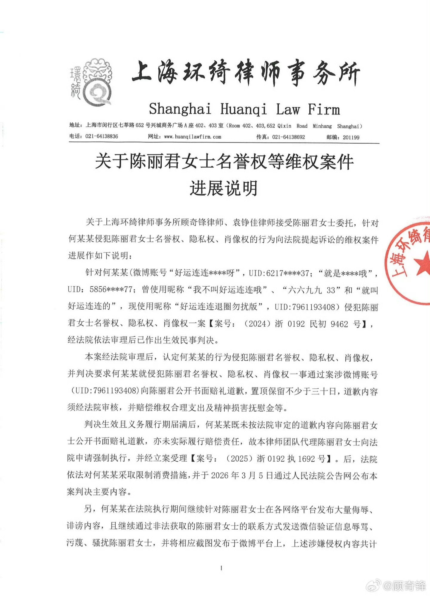 陈丽君方发布告黑进展,支持维权!陈丽君告黑进展