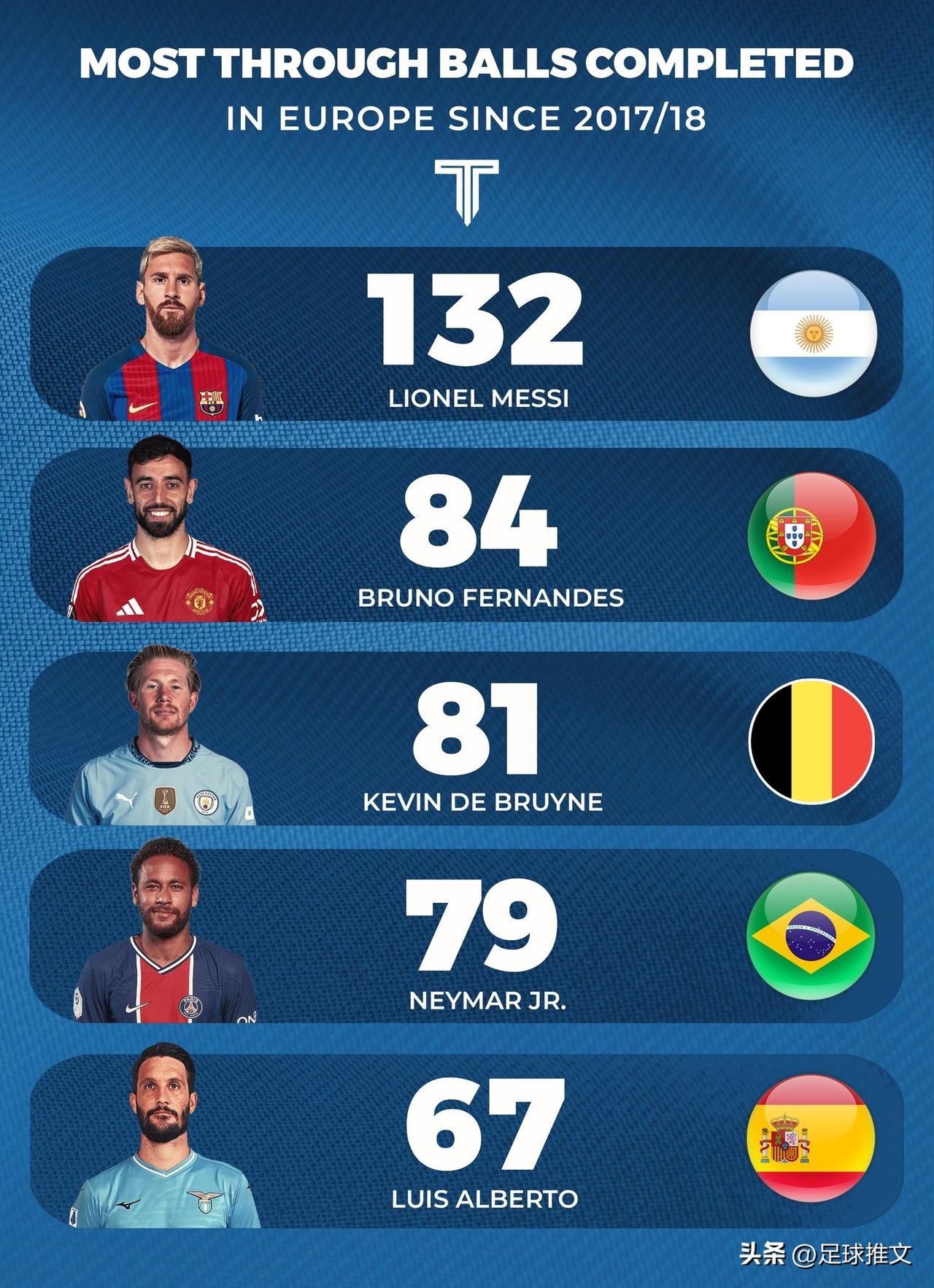 自2017/18赛季以来,欧洲五大联赛中完成直塞球成功次数最多的排名: • 梅西:196场比赛中完成132次 • B费尔南德斯:223场比赛中完成84次 • 德布劳内:235场比赛中完成81次 • 内马尔:112场比赛中完成79次 • 路易斯·阿尔贝托:233场比赛中完成67次