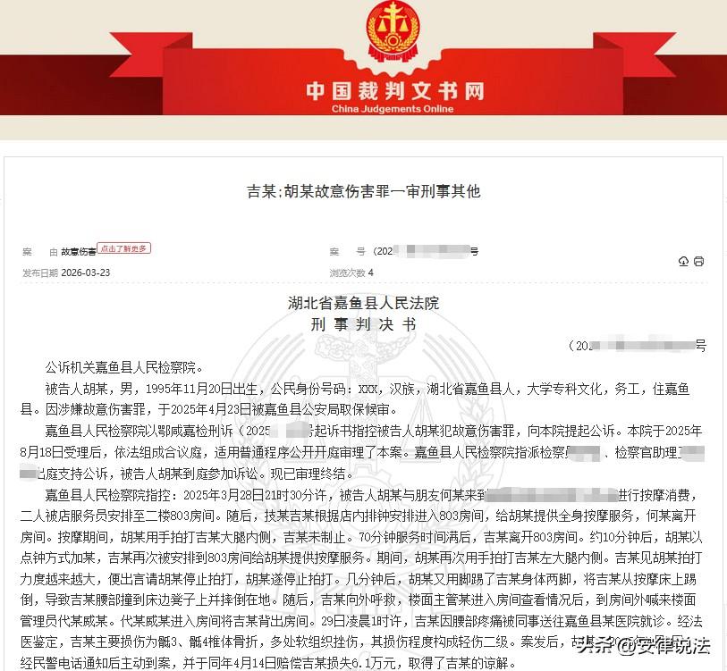 湖北,男子酒后到一足疗店按摩,期间,多次拍打女技师的大腿内侧。女技师想着男子喝多了便没和男子计较,也没制止男子。怎料,结束后,男子又加个一个钟,又再次遇到了同一个女技师,期间,再次用手拍打女技师的大腿内侧,还询问女技师有没有特殊服务。女技师见男子力度越来越大,忍无可忍,出言让男子轻点,并表示没有特殊服务。哪曾想,男子来了脾气,二话没说,直接踢了女技师两脚,将女技师从按摩床上踢倒,导致女技师腰部撞到床边凳子上并摔倒在地。事后,因经鉴定女技师的伤情达到轻伤二级,男子悲剧了,赔了女技师6.1万元,还被以故意伤害罪,判处拘役6个月,缓刑1年。 据悉,2025年3月28日21时30分许,男子胡某与朋友何某喝完酒,一起到一足疗店按摩。 足浴店将两人安排到一个房间里。 两人在房间里等了一会儿后,由于只有一名女技师吉某空闲,何某便将胡某先按,而后离开房间。 吉某为胡某按摩期间,胡某便显得有些不老实,时不时用手拍打吉某的大腿内侧。 吉某心里清楚,干她们这行,难免碰见这样的爱占便宜的客人,也不想轻易得罪客人,也就没有制止胡某。 就这样,吉某忍着不适,为胡某做完了70分钟的全身按摩服务。 然而,吉某刚刚离开的房间,还没来得及休息,又被店里通知前往胡某所在的房间,为胡某服务。 原来,吉某离开后,便又要求加钟,因彼时只有吉某闲着,店里又安排了吉某为胡某服务。 吉某虽有些不情愿,但想着是工作,也没有办法,只能再次为胡某服务。 而这次刚开始为胡某按摩,胡某便又开始拍打吉某的大腿内侧,而且力度比第一次大了不少,一下比一下重,还询问吉某有没有特殊服务。 “没有!”“要不轻点?开玩笑也得有个尺度!”吉某忍无可忍,一边表示没有特殊服务,一边出言制止胡某。 哪曾想,胡某安静了几分钟,而后二话没说,踹了吉某两脚,直接将吉某从按摩床上踢了下去,腰部重重撞到了床边的凳子上,摔在地上。 吉某懵了,等反应过来疼的浑身冒汗,连忙呼救。 “你还装,我看你装到什么时候!”胡某见状还以为吉某是装的。 恰逢彼时,按摩店里的其他工作人员听到声音后立刻冲进房间房间,看到吉某躺在地上动弹不得,赶紧跑到房间外,喊来其他同事,将吉某背出房间休息。 吉某休息了一两个小时也没有好转,而后被同事送到医院。 医院诊断,吉某的骶3、骶4椎体骨折,多处软组织挫伤,吉某报警后,法医鉴定吉某的伤情已经达到了轻伤二级的程度。 《刑法》第234条规定,故意伤害他人身体的,致他人轻伤的,处3年以下有期徒刑、拘役或者管制。 醉酒不是免责的理由!《刑法》第18条第4款规定,醉酒的人犯罪,应当负刑事责任。 随后,警方以涉嫌故意伤害他人罪对胡某立案调查,而后移送检方审查起诉。 由于胡某在第一时间接到民警的电话后,便主动投案自首,过程中选择认罪认罚,同时还赔偿了吉某6.1万元,取得了吉某的谅解,检方审查后,在对胡某提起公诉时,建议以故意伤害罪,判处胡某拘役6个月,缓刑1年。 法庭上,胡某对检方起诉指控的事实供认不讳,并当庭认罪悔罪,无辩解意见。 法院审理后,最终采纳了检方的意见,以故意伤害罪,判处胡某拘役6个月,缓刑1年。 这事您怎么看?欢迎在评论区留言,与大家一起交流您的看法! ------ 关注@安律说法 案例中看人生百态,法律中寻破局之法!(注:案件来源裁判文书网、湖北省嘉鱼县人民法院,图片来源网络)