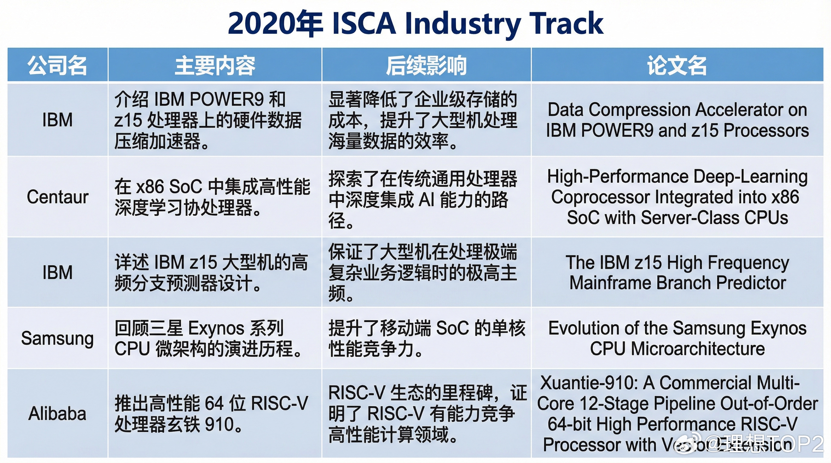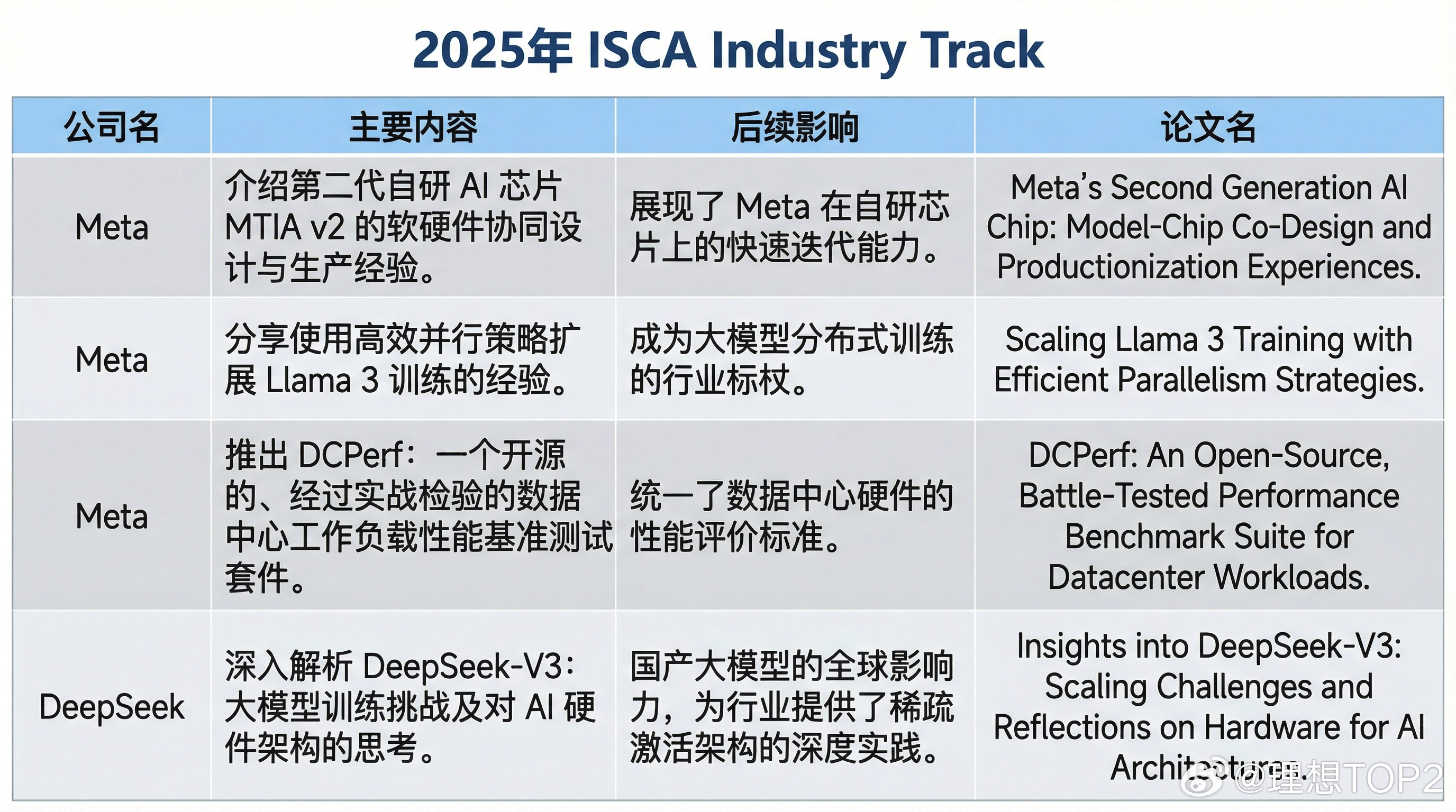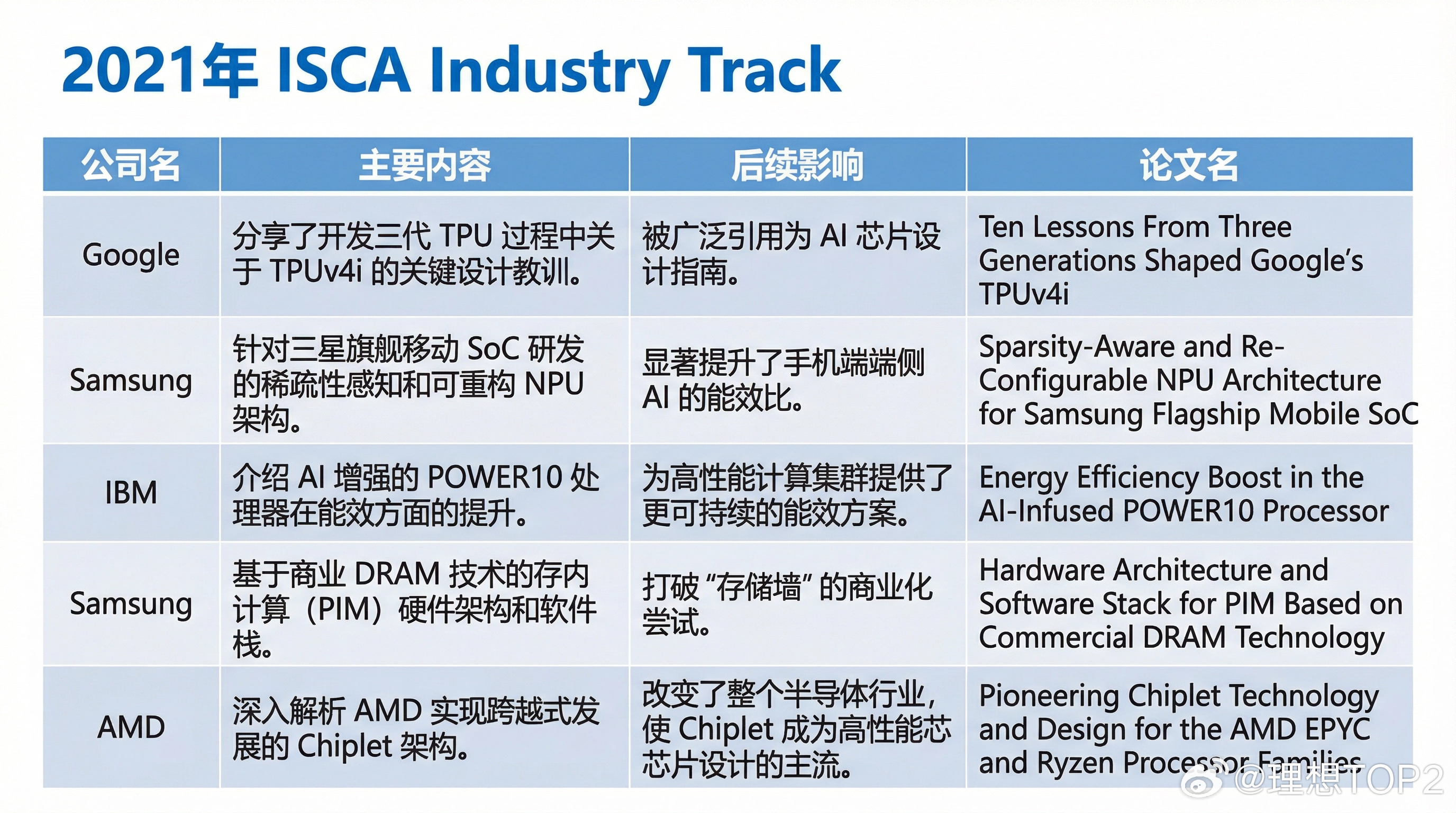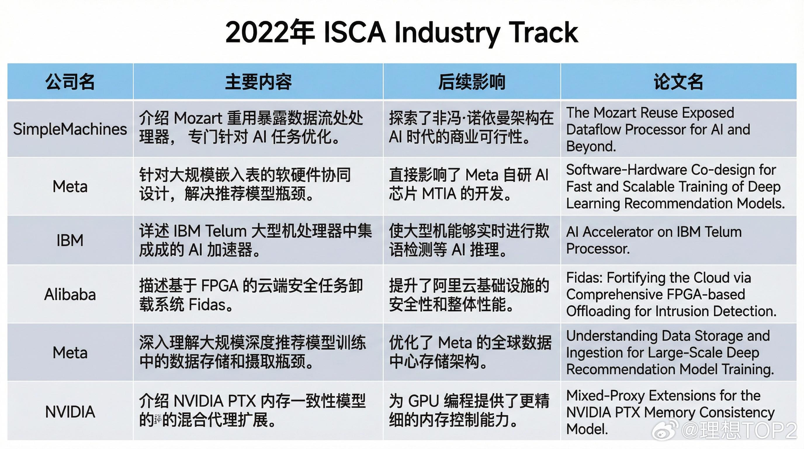 理想这次入选的ISCA Industry Track门槛真挺高的2025年6月29日TOP2发文不用给理想入选ICCV高评价, 牛的是理想的工作, 不是ICCV,这里核心锚点是现在ICCV一年要录用两三千篇论文,对于理想这种体量的公司而言,在头部会议Main Track发多篇论文是认真做就能做到的事。ISCA Industry Track则不同,从2020年开始有独立的评审委员会和专门的标识,一年只录取4-6篇左右,要求第一作者必须是工业界,必须是真实量产或准量产成果。即这不是说理想M100芯片这事投稿就一定能被录取的,确实是一个挺高的硬门槛。Camera-Ready时间是2026年5月9日,推测M100芯片的论文会在4月上arXiv,上arXiv后TOP2会尽快向读者分享相关内容。以下为此前入选ISCA Industry Track的论文,主要内容,后续影响,公司名。