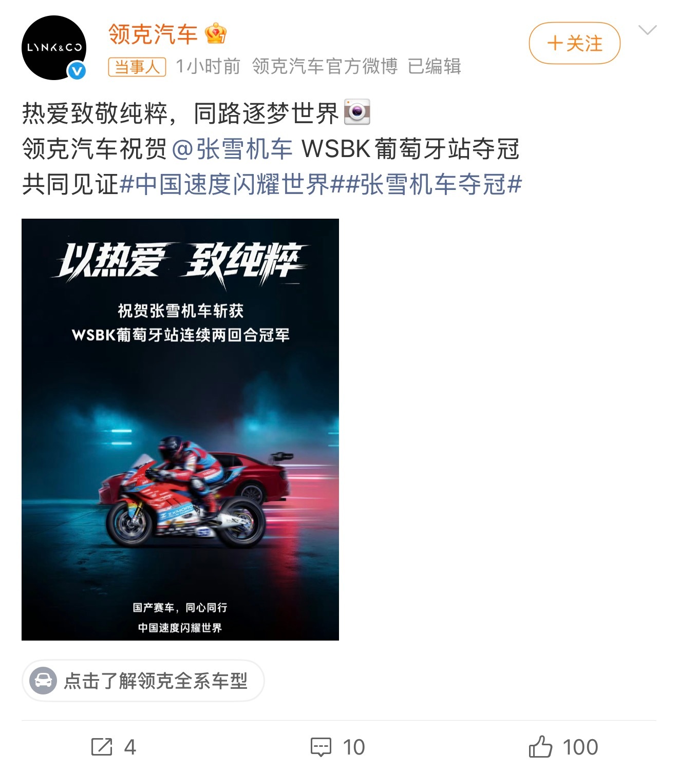 领克祝贺张雪机车夺冠这不就是当年的领克吗?用实力打破质疑!四轮和两轮都争气了