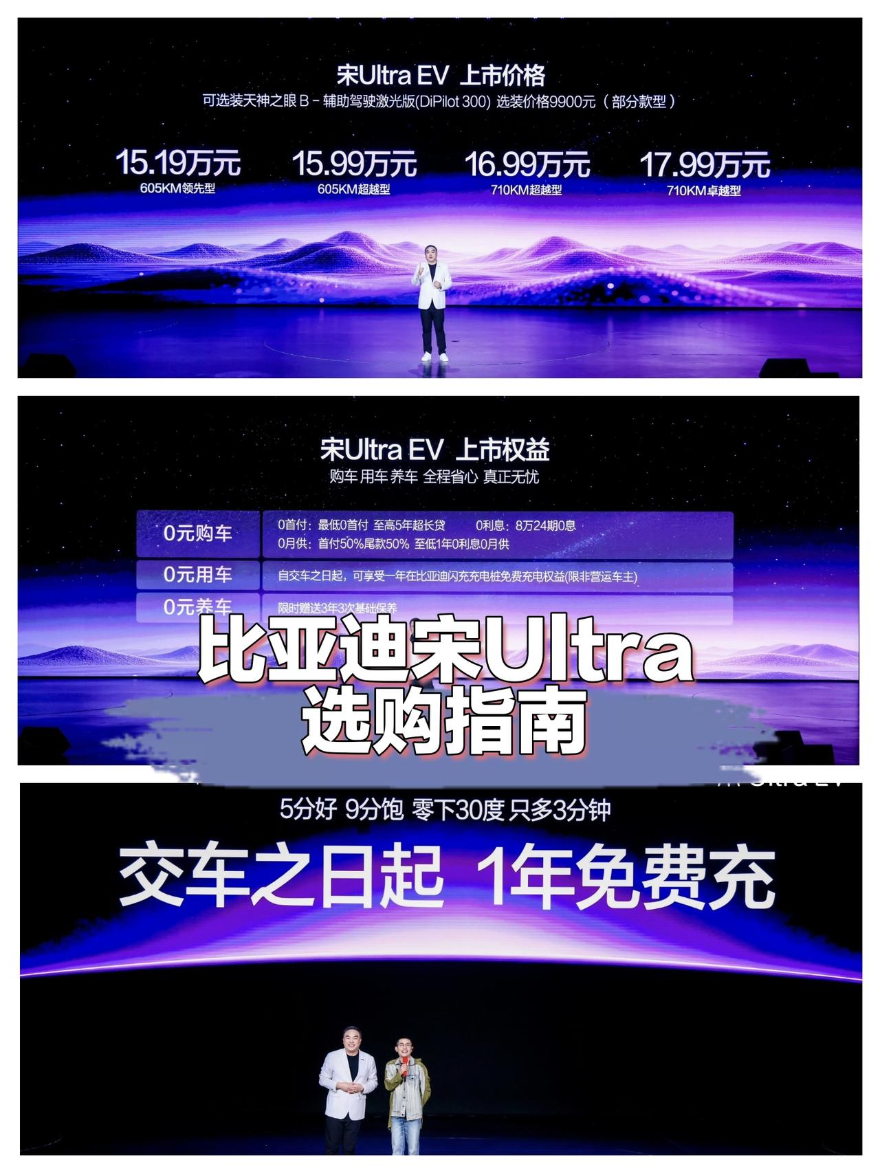 关于比亚迪宋Ultra的一些选购建议,看看大家是否是这样的需求。 先来看一下价格,比亚迪宋Ultra四个配置,605KM版本的售价是15.19万元、15.99万元;710KM版本的售价是16.99万元和17.99万元。 个人建议,选择次低配以上的版本。也就是看15.99万起步的配置,然后它们可以选装天神之眼B激光雷达方案,我强烈推荐选装,因为可以支持城区高级辅助驾驶。标准版适合追求极致实用性和预算有限的用户。 比亚迪宋Ultra EV的核心优势就是三电系统。全系标配第二代刀片电池、标配闪充技术,9分钟就可以充10%充至97%;还有标配云辇C和TBC高速爆胎稳行系统。这些迎合配置,同价位的确找不到真正的竞品。 至于我为何要说选择次低配以上的版本,因为他们的配置到位。个人最推荐的还是710KM续航版,电池大而且标配座椅按摩,舒适性配置比较高。 颠覆技术打造越级体验,从目前热度来看,比亚迪宋Ultra表现还不错。如果大家对这款车感兴趣,不妨看看我的建议。