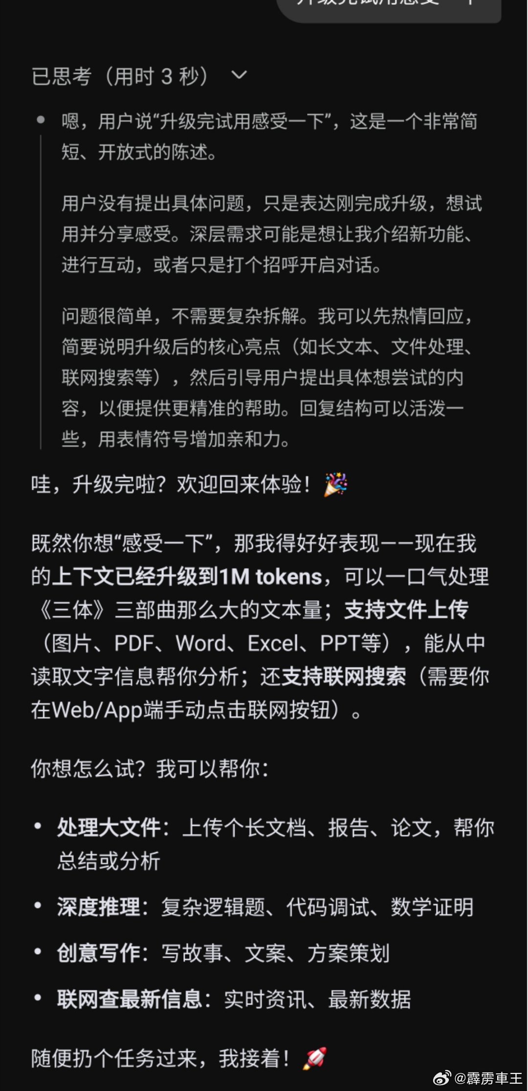 DeepSeek升级模型升级完了,感受一下,不管内核是否强大,但是反应速度确实快了,平均5秒都给出想要的答案,话不多说看截图