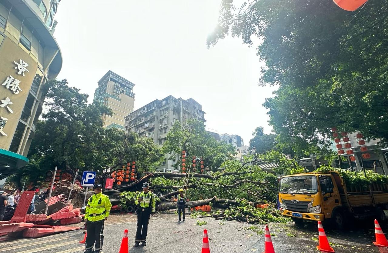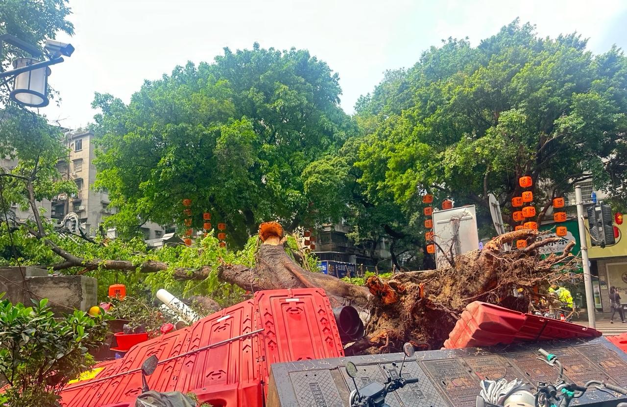 北京路周边百年大树连根拔起 广州好像好多年都没有试过这么大雨了 昨天下午和今天早上的大暴雨是有点吓人的 书坊街前面的百年大树也被连根拔起