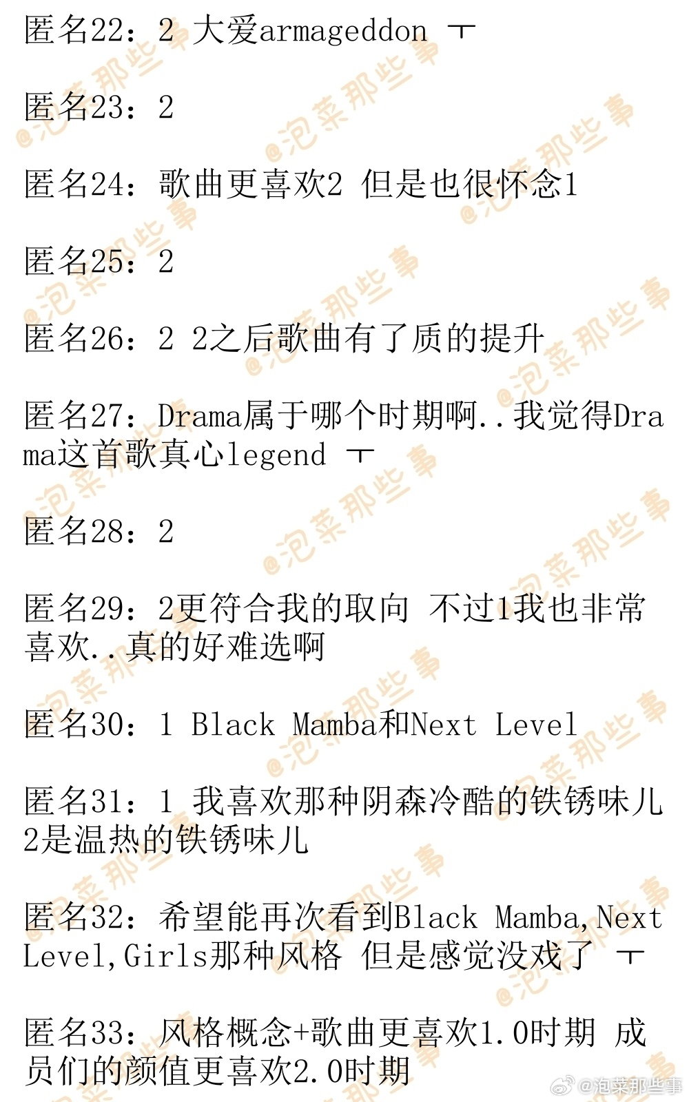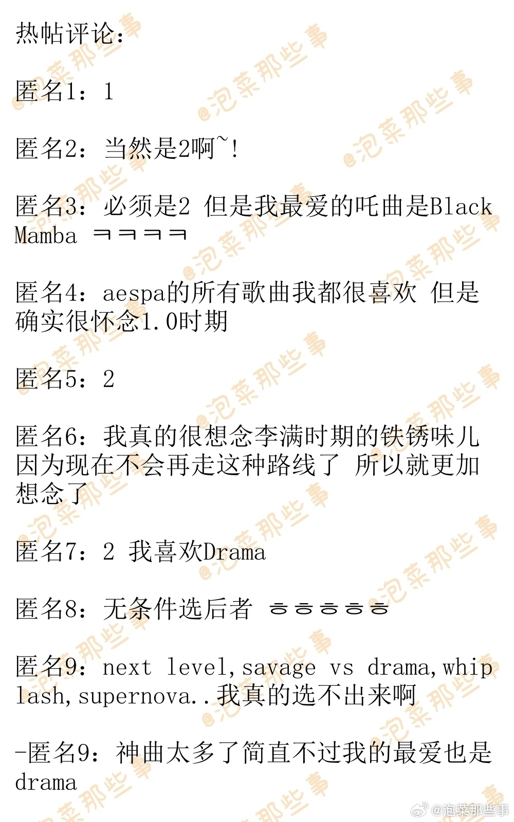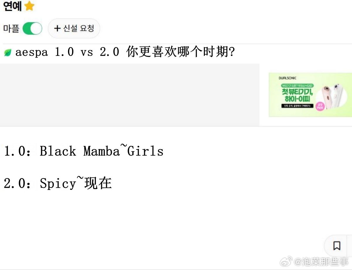 🔥韩网热帖评论翻译🔥aespa 1.0 vs 2.0 你更喜欢哪个时期?1.0:Black Mamba~Girls 2.0:Spicy~现在 cr.instiz