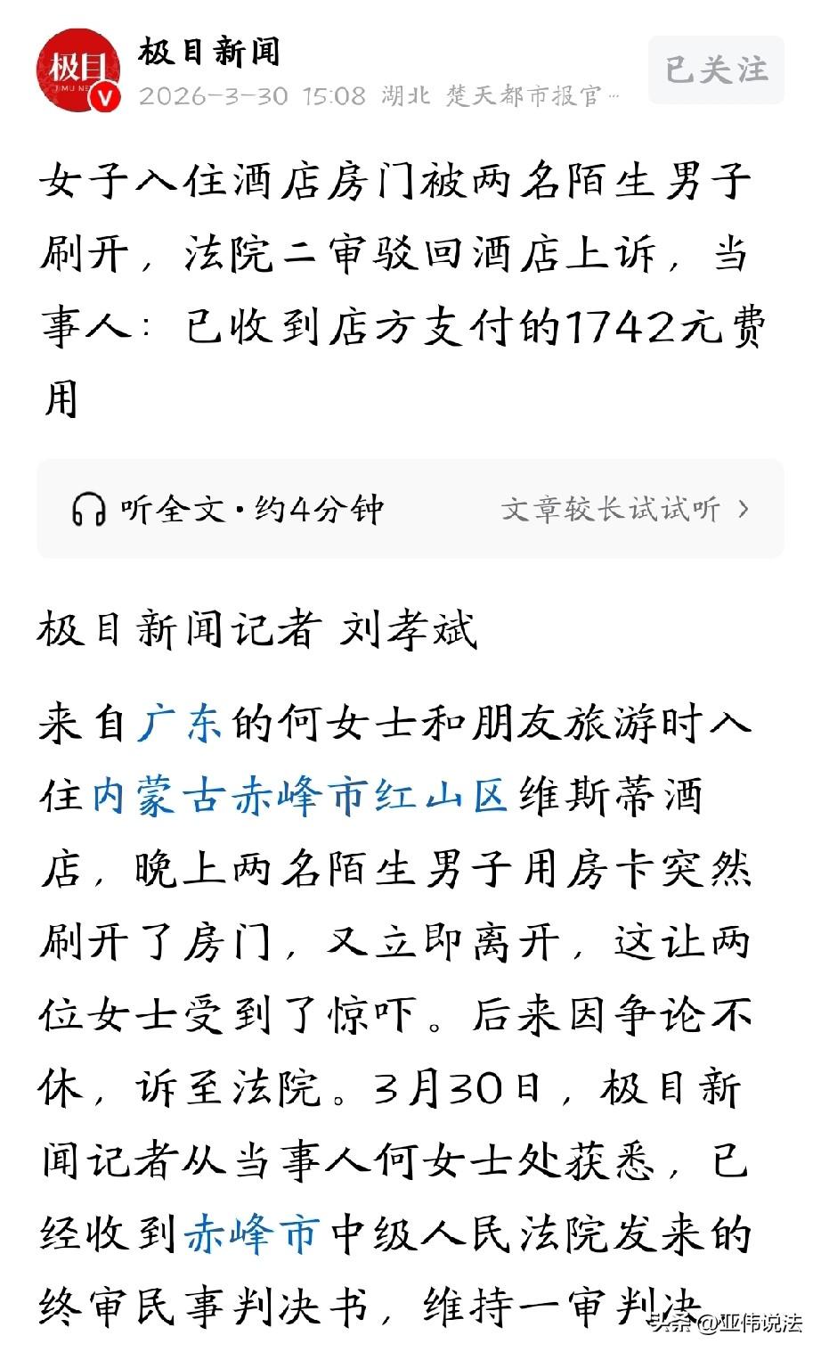 太吓人了!内蒙古赤峰,女子和闺蜜旅游时入住了一家酒店,谁知睡到半夜,房门突然被两名陌生男子打开,其中一个还赤 裸上身。女子们吓得半死,赶紧联系前台,谁知前台一开始说怪她们没关好门,后面才承认,是系统出了问题,把两个房卡搞混了。当时酒店承诺,退回192元房费,可第二天就翻脸不认账。女子被这种敷衍的态度气个半死,一纸诉状告上法庭,法院的判决大快人心。 31岁的何女士至今记得,去年6月在赤峰酒店的惊魂一夜,那声“咔哒”的刷门声,成了她好几个月的噩梦。 2025年6月,何女士和闺蜜攒了年假,从广东出发,先在北京逛了故宫、爬了长城,随后坐高铁到赤峰,打算领略草原风光。 当地导游帮忙预订了当地一家酒店,两人住在613房间。 6月12日晚上,累了一天的两个人洗漱完毕,准备进入梦乡,突然“咔哒”一声,房门突然被人从外面刷开了。 何女士抬头的瞬间,心脏差点跳出来,两名陌生男子站在门口,其中一个还赤裸着上身,手里拿着房卡。 幸好她们进屋时顺手挂了安全锁,房门只开了一条缝。 闺蜜王女士吓得尖叫一声,对着门外喊∶你们干什么?那两名男子愣了一下,对视一眼没说话,转身快步走了。 两人惊魂未定挤在房间角落,王女士手抖着拨通了前台电话说明情况。 谁知,上来处理的工作人员只是试了试房卡,就轻描淡写地表示,是她们没关好门,他们房卡系统不会有问题。 这可把两人气坏了,再三要求下,值班经理才磨磨蹭蹭赶来,支吾了半天,才说是酒店当天系统升级出了BUG,把616房客的房卡权限和613的弄混了。 对方主动提出,给她们换楼层,并承诺第二天退房时免掉192元房费。 于是,何女士当晚就搬到了另一个楼层 可第二天退房时,之前承诺免房费的酒店经理加了王女士微信后,就没了下文。 王女士催了好几次,对方先是说“正在申请”,后来又开始卖惨,说基层员工不容易,别难为他们,还以个人名义转了两次200块,都被王女士退了回去。 她们要的不是钱,是酒店的一个态度! 从一开始的推诿责任,到后来的敷衍了事,酒店的反应让她们觉得,顾客的安全在酒店眼里根本不值一提。 沟通无果后,何女士他们把遭遇发到了网上,想提醒其他游客注意。 没想到酒店很快发了声明,反说她们“恶意抹黑”,双方在评论区吵了起来。 看着酒店蛮不讲理的态度,何女士也毫不留情,将酒店告上法庭。 《民法典》第一千一百九十八条规定∶宾馆、商场、银行、车站、机场、体育场馆、娱乐场所等经营场所、经营者、管理者或者群众性活动的组织者,未尽到安全保障义务,造成他人损害的,应当承担侵权责任。 酒店因系统BUG,将其他房客的房卡权限与613房混淆,导致陌生男子深夜刷开何女士等人的客房门,直接违反了安全保障义务 。 客房是旅客高度私密的空间,酒店有绝对责任确保房卡唯一对应、门锁系统稳定可靠,防止无关人员非法侵入。 何女士等人虽未遭受身体伤害,但深夜被陌生男子闯入的经历,严重侵犯隐私与居住安宁权,造成持续精神恐惧与心理创伤。 综上,法院判决酒店退还192元房费,并支付精神补偿和律师费共计1692元。 对此酒店不服,提起了上诉,坚称自己已经尽到责任,是客人“过度反应”。 中级法院审理后认为,一审判决认定事实清楚,适用法律正确,驳回酒店上诉,维持原判,同时要求酒店承担50元二审案件受理费。 3月30日,何女士终于收到了酒店转来的1742元。 何女士说,其实钱不多,但就是争一口气。 针对此事,记者联系了酒店前台,工作人员表示不清楚此事,只说他们酒店一直很注重客人安全。 女性出门在外,最看重的就是安全,酒店的失误让她们陷入危险,事后又如此散漫的态度,实在让人寒心。 现在虽然拿到了赔偿,但她还是希望酒店能好好整改房卡系统,别再让其他游客遭遇这种惊魂时刻。