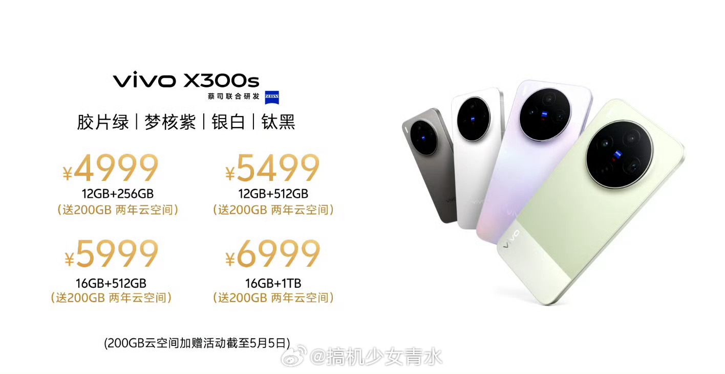 vivo X300s超能小V单价格来了vivo X300s :4999元起,蔡司2亿主摄+APO长焦+V3+芯片,全焦段闪光灯,逆光也出片。 这个价格如何