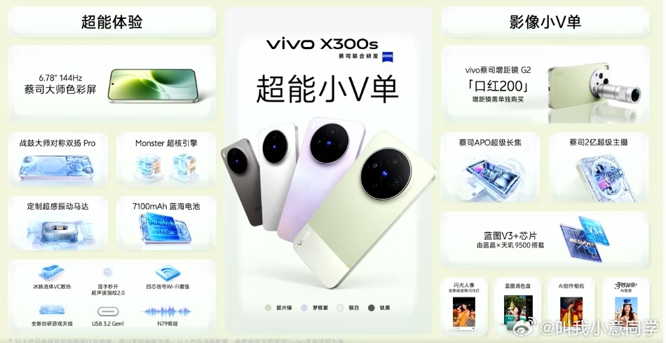 刚看完发布会,给你们说说 vivoX300s到底有多Super!首先作为超能小V单,影像必须得拉满。硬件直接上了蔡司2亿超级主摄+APO超级长焦,搭配蓝图影像芯片V3,不管是拍人还是拍景都很出彩。Ultra同款的全焦段变焦闪光灯,暗光人像也能轻松出片,加上AI创作相机和蓝图调色盘更是可玩性满满。而且你敢信,作为一台影像旗舰,性能居然也没落下。屏幕用的是144Hz电竞级直屏,加上iQOO同款的Monster超核引擎,原神吃鸡稳得很。电池直接上了7100mAh蓝海电池,这是X系列最大的,加上90W有线和40W无线,长时间畅玩都没问题。
