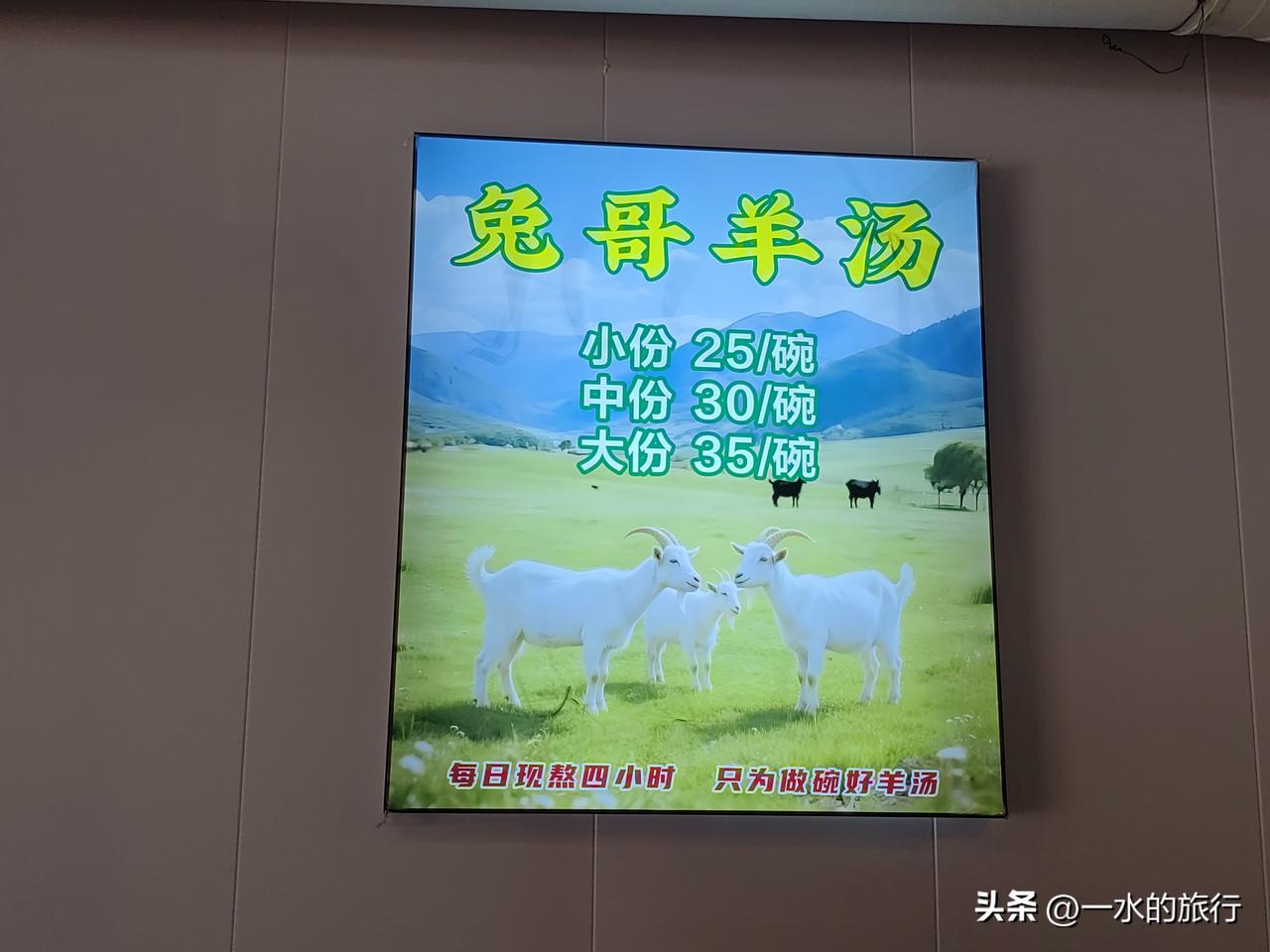 前几天去潍坊办事,听朋友介绍,来到一家羊汤店,听说很不错,那一定要尝一下。 坊子兔哥羊汤是一家颇具特色的羊汤馆,由当地一位卖二手车的兔哥开设。他的小店主打全羊汤,选用临朐小公山羊,现杀鲜羊制作,每碗有2两肉、1两杂,还免费赠送羊血。 羊汤由大骨熬制4小时以上,不添加羊油和任何添加剂,口味清淡,原汁原味。此外,店内还有铜火锅等菜品。 全羊汤28元一碗,加2元可享饼自助。店内提供免费的小菜自助,种类丰富且用心制作。味道非常不错,值得品尝。特别是现烙的油饼,那叫真香。 关键是老板兔哥的承诺,透着狠动,所用食材皆为正宗小山羊,假一赔十;现杀鲜羊,假一赔百;全羊汤足斤足两,缺一罚千,力求为顾客提供健康、纯正的羊汤。特色羊汤店