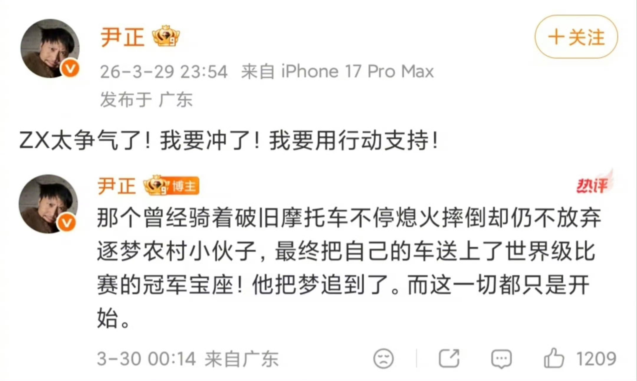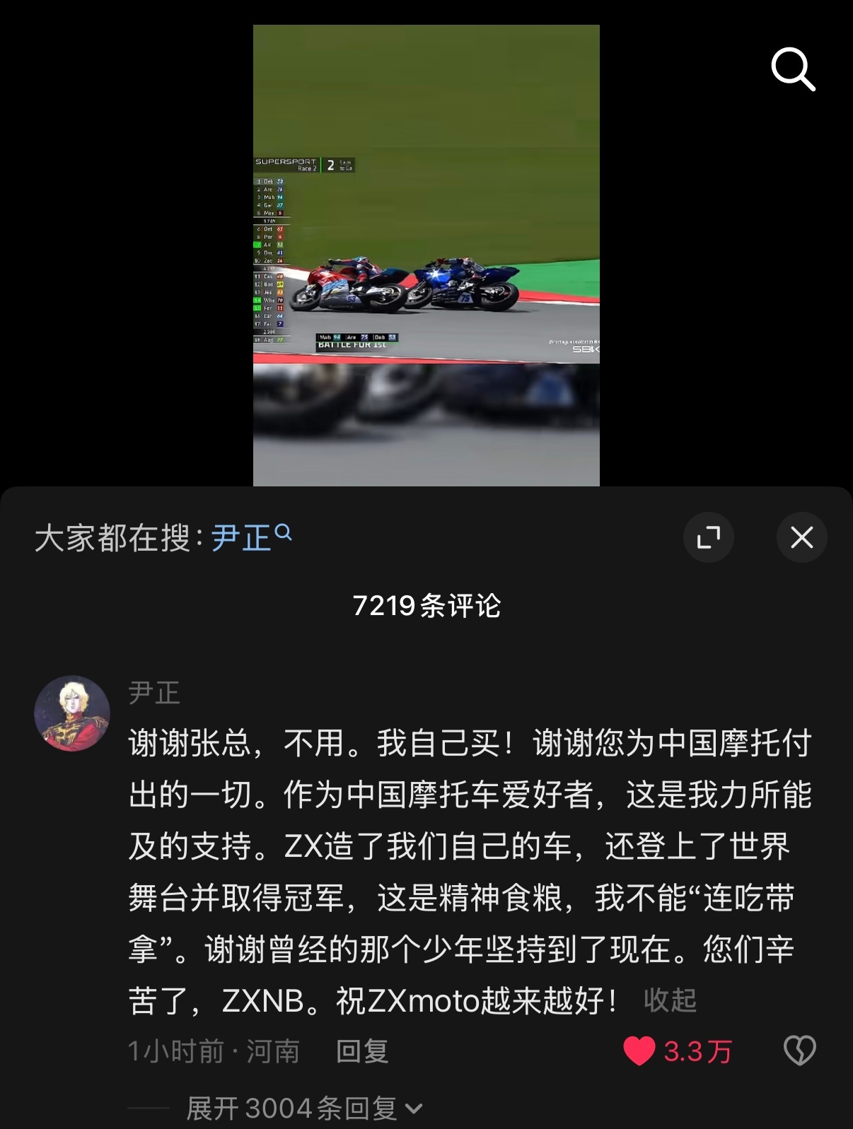 张雪说要赠送尹正机车张雪机车WSBK两连冠,国产之光!尹正:张雪太争气啦!张雪:没钱请代言,送车求测评!尹正:谢谢,我自己买!这才是对国产最好的支持!双向奔赴,太燃了!