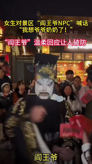女孩对着“阎王爷"说想爷爷奶奶,他的回应瞬间让全网破防 谁能想到,平日里威严吓人的阎王爷NPC,却藏着最软的一颗心。 景区里,一个女孩对着扮演阎王爷的NPC,小声说出了藏在心底的牵挂:“我想爷爷奶奶了。” 我以为NPC会按剧本走流程,没想到他瞬间放软了语气,温柔地开口:“宝贝,你的爷爷奶奶好像没有在我这里啊,他们在天堂享福呢。” 短短一句话,没有生硬的安慰,却像一双手轻轻接住了女孩的思念,也戳中了无数人的泪点。 原来,真正的温柔,从来都不分角色与剧本。这世间所有的离别,都只是换了一种方式守护着我们。暖心瞬间 遇见生活的温柔时刻