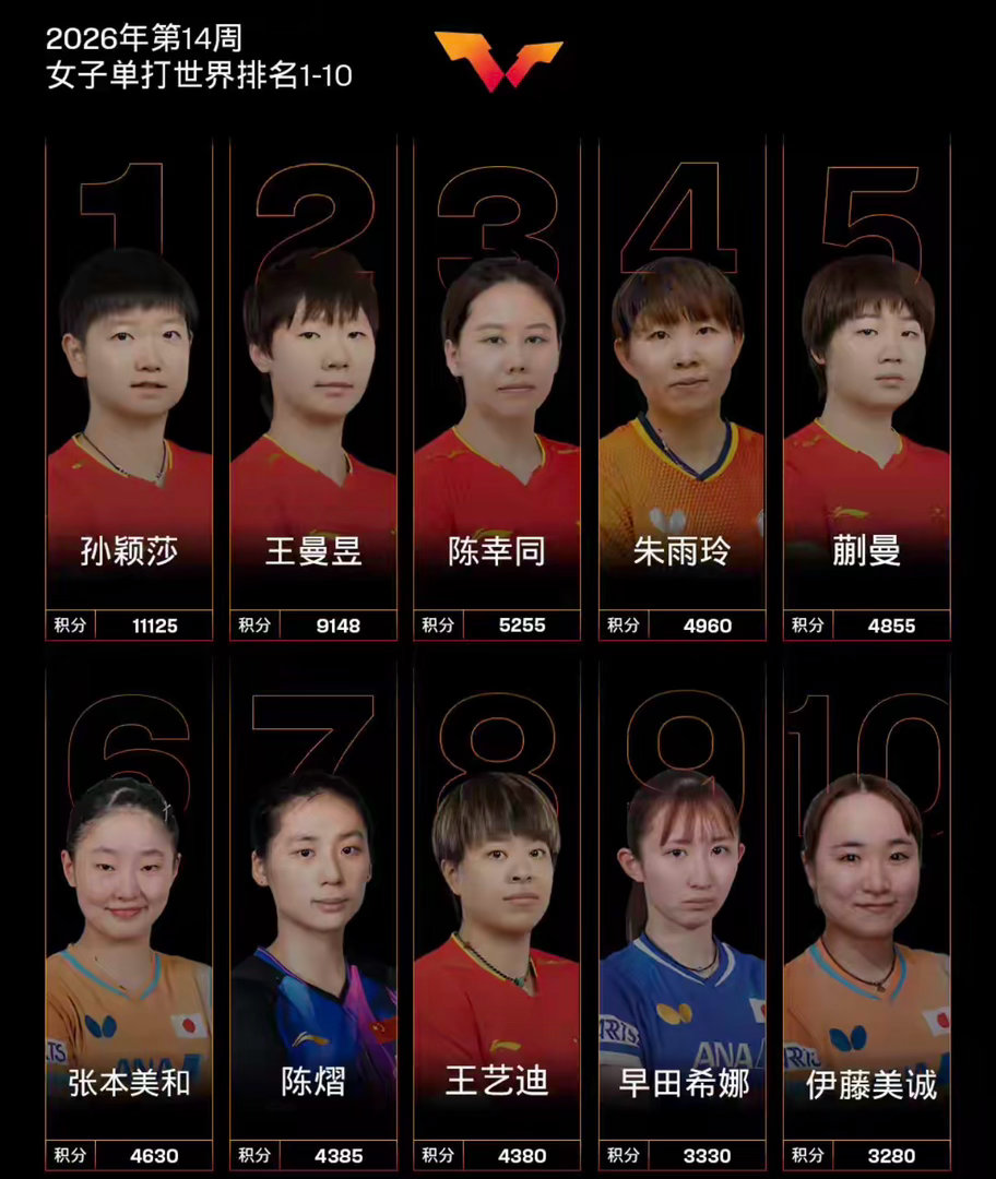 3月30日,WTT世界乒联公布2026年第14周世界排名:男子单打,中国队球员王楚钦位列第一,林诗栋位列第五,向鹏位列第九。WTT常规挑战赛突尼斯站男单冠军弗拉芬·科顿排名上升5个名次位列21,刷新个人职业生涯排名新高;亚军篠塚大登排名上升5个名次位列30;四强若奥·格拉尔多排名上升17个名次位列54;四强吉村真晴排名上升41个名次位列85;八强玛纳什·沙排名上升12个名次位列52;八强弗拉基米尔·西多伦科排名上升8个名次位列35,刷新个人职业生涯排名新高。其他中国队球员,梁靖崑排名第13,温瑞博排名第17,周启豪排名第23,陈垣宇排名第24,陈俊菘排名第37。女子单打,中国队球员孙颖莎、王曼昱、陈幸同位列前三,蒯曼位列第五,陈熠位列第七,王艺迪位列第八。WTT常规挑战赛突尼斯站女单冠军伊丽莎白·阿布拉米安排名上升58个名次位列45;四强肖瑶茜排名上升15个名次位列47,刷新个人职业生涯排名新高;四强马尔加里塔·佩索茨卡排名上升16个名次位列50;八强尼娜·米特兰姆排名上升11个名次位列54;八强简彤娟排名上升16个名次位列63;八强亚沙斯维妮·戈尔帕德排名上升24个名次位列69,刷新个人职业生涯排名新高;八强竹谷美涼排名上升21个名次位列73,刷新个人职业生涯排名新高;蒯曼排名上升1个名次位列5;申裕斌排名上升1个名次位列13;石洵瑶排名上升1个名次位列14;郑怡静排名上升1个名次位列18。其他中国队球员,石洵瑶排名第14,何卓佳排名第37,覃予萱排名第38。