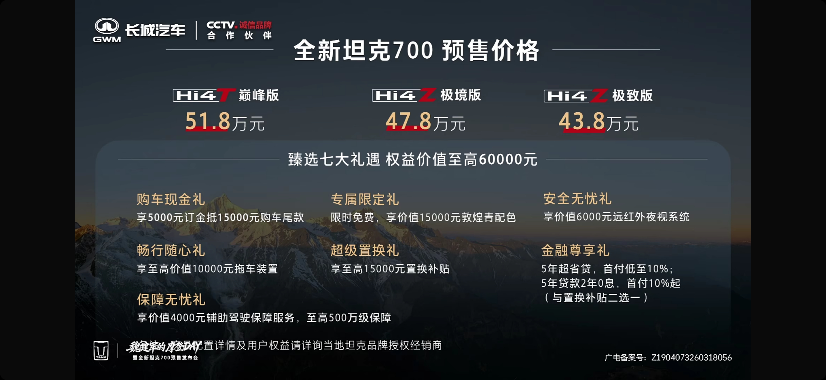 全新坦克700新时代新旗舰坦克700发布了预售价:Hi4-Z 极致版 43.8万元Hi4-Z 极境版 47.8万元Hi4-T 巅峰版 51.8万元搭配预售政策,车价能直接再减1万元想研究一下配置,app 直接崩了,这像话吗?有钱大哥还是多🤦♂️